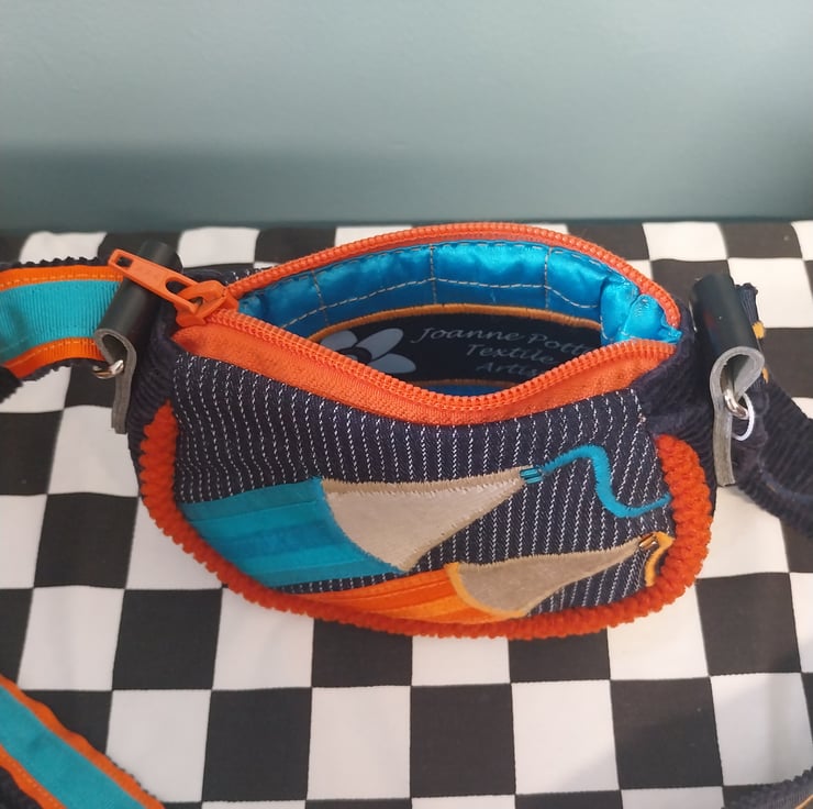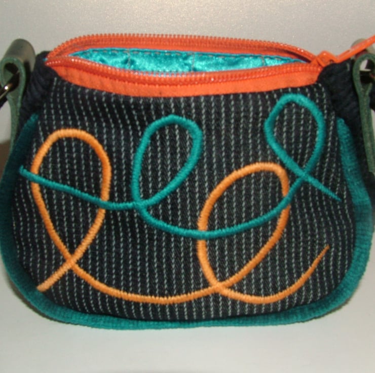 The Purse fastens with a Orange zip to a Turqoise quilted satin lining with contrast Orange stitching and makers label.
