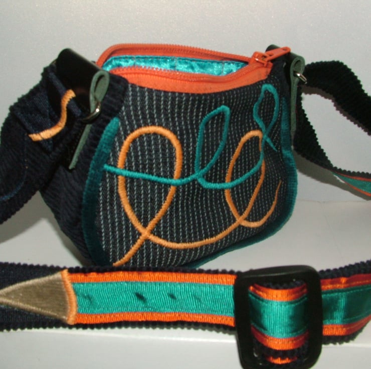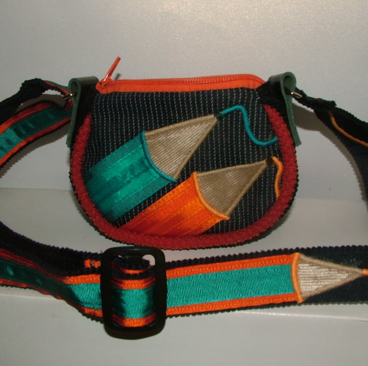 The front is a Navy denim, which has 2 ribbon pencils (one Orange, one Turqoise), with a zigzag stitch colour trail. the pencil leads are hand sewn sequins, to give an extra sparkle.