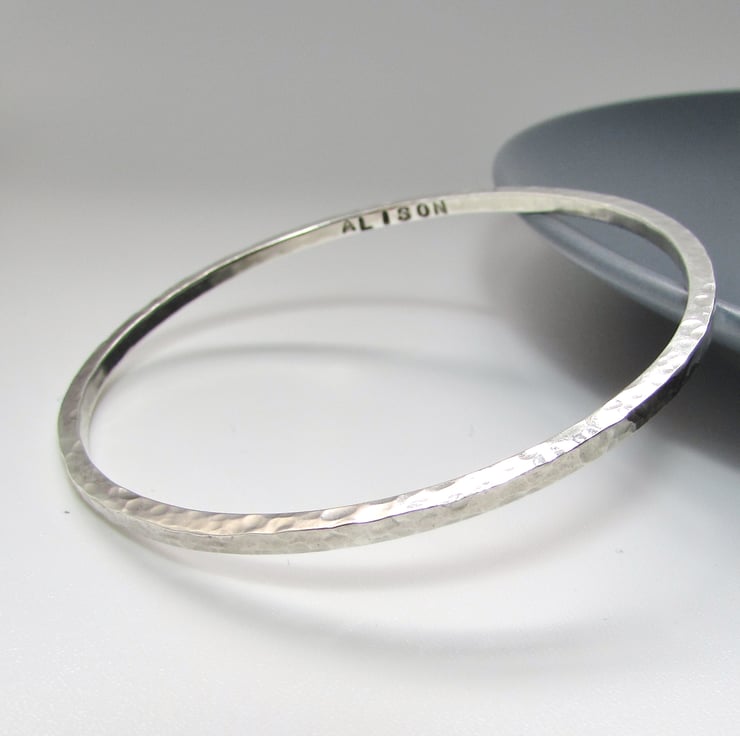 Rather than machine engraved, the bangle is hand stamped so there may be small irregularities and this adds to it's charm! The lettering is darkened to make it stand out and then the whole piece is polished to a high shine.