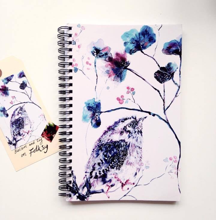 Spiral bound notebook with my illustrated bird design printed on the front cover.