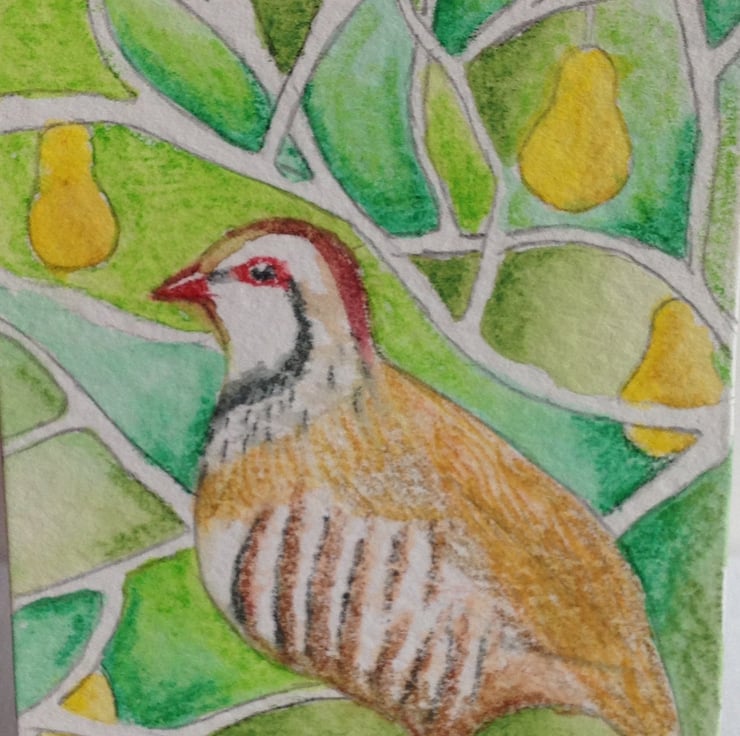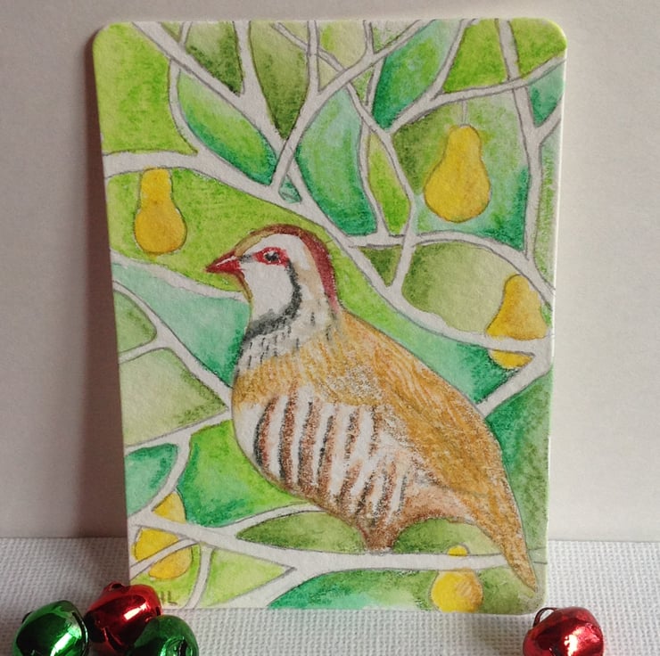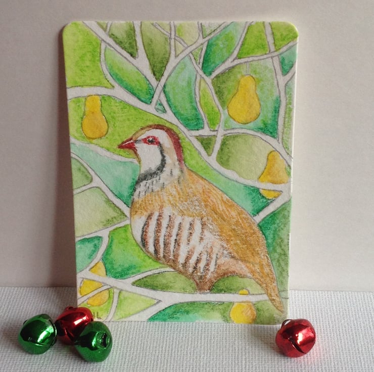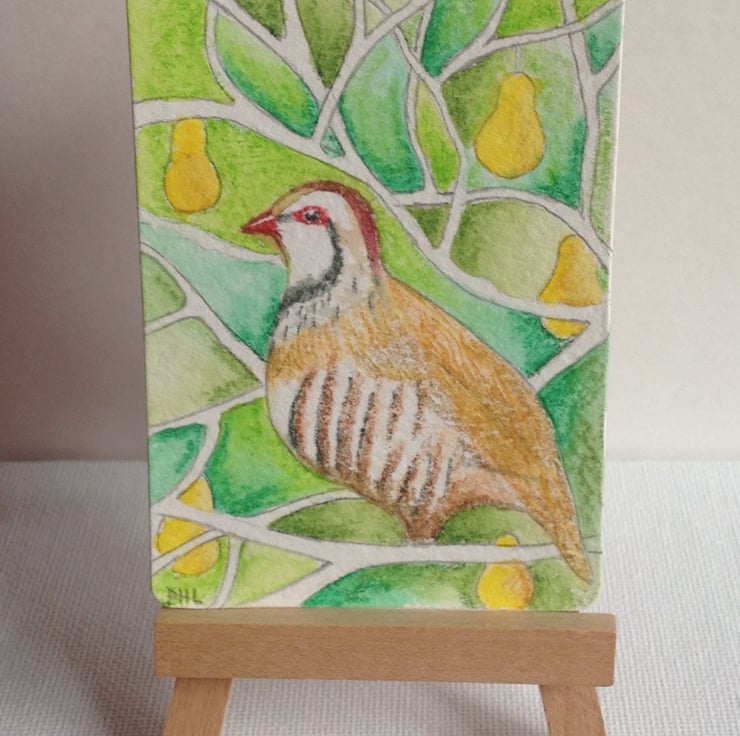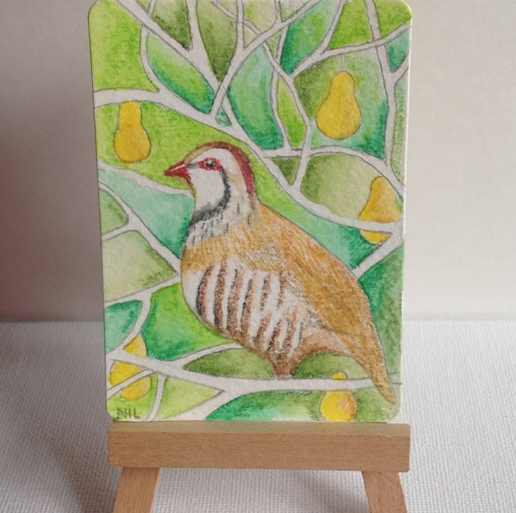 On the first day of Christmas, why not give an affordable partridge in a pear tree? An original ACEO interpretation of the Christmas song that could start an original art collection for the recipient.