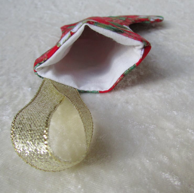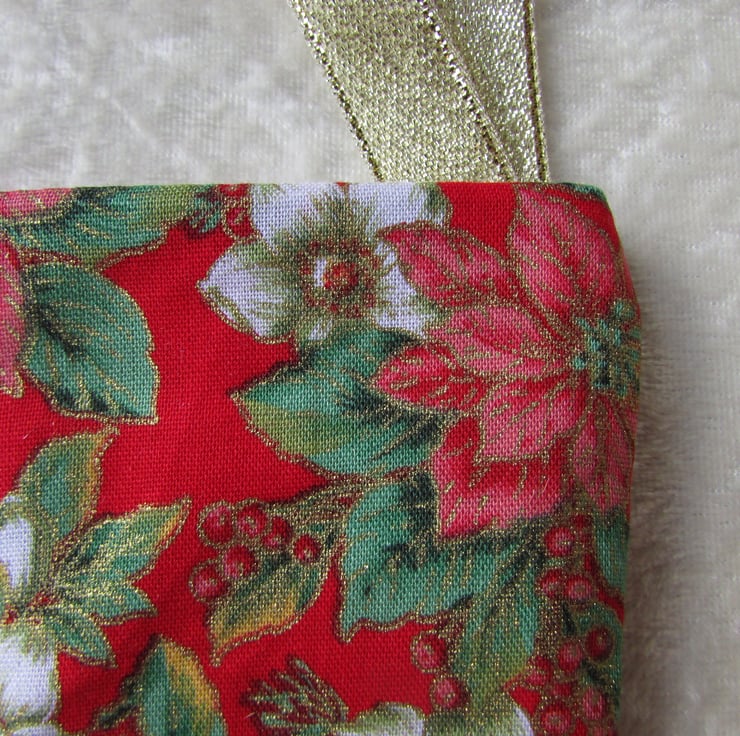 Made from a lovely red fabric with a pretty green, white and gold Christmas floral print pattern. The stocking is fully lined with cream fabric and has a gold sparkly hanging ribbon.