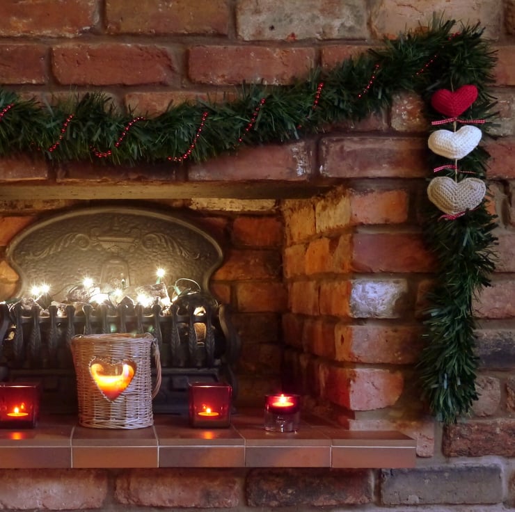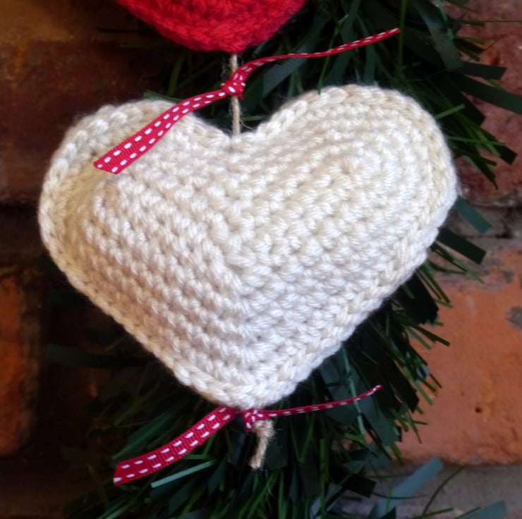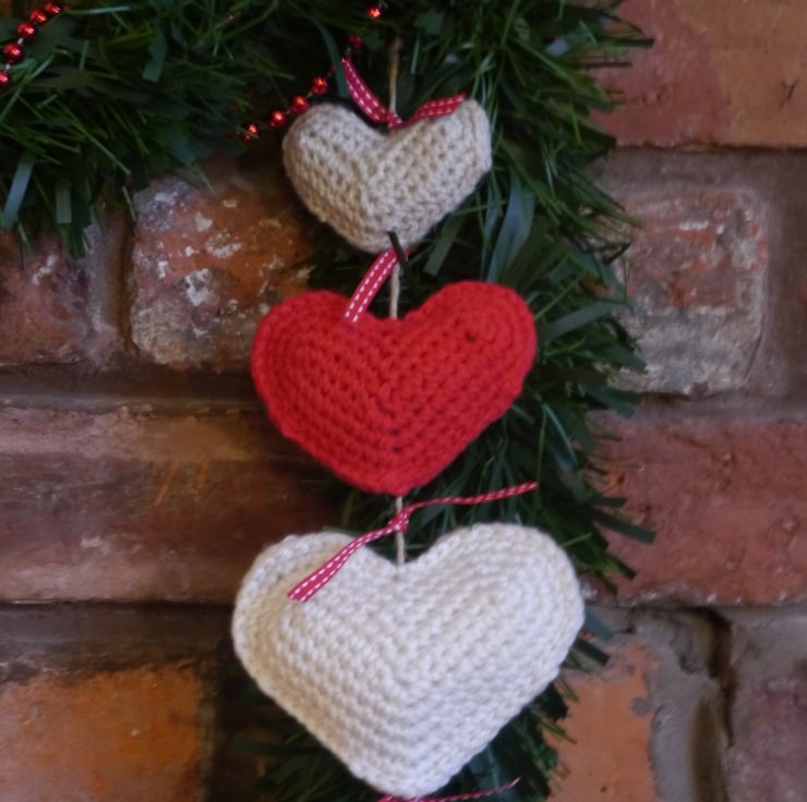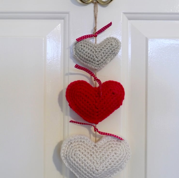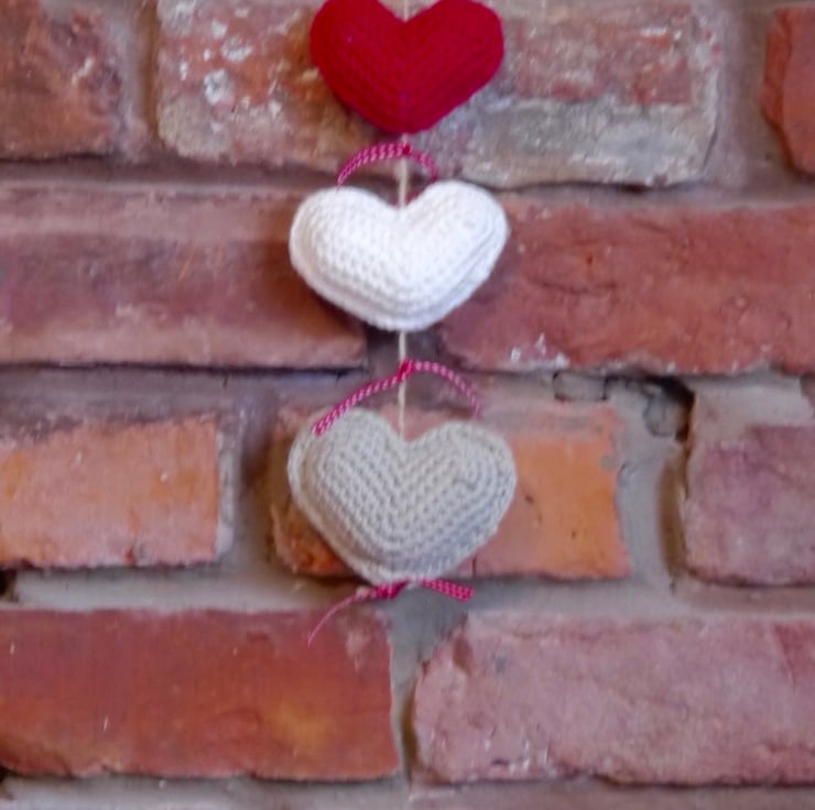 MADE TO ORDER - A pretty hanging decoration with crocheted stuffed hearts that can be placed on the back of a door or maybe around a fireplace. It consists of three different sized hearts each measuring approx 8cm, 9cm and 10cm across widest part. It measures approx 30cm in length including the string loop for easy hanging.