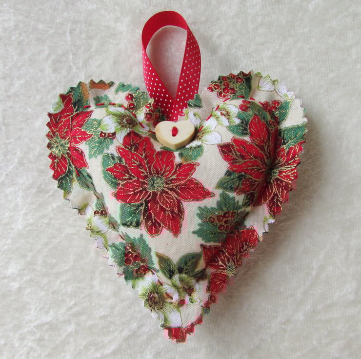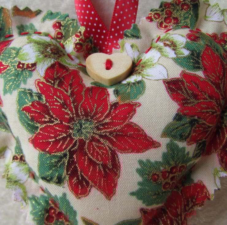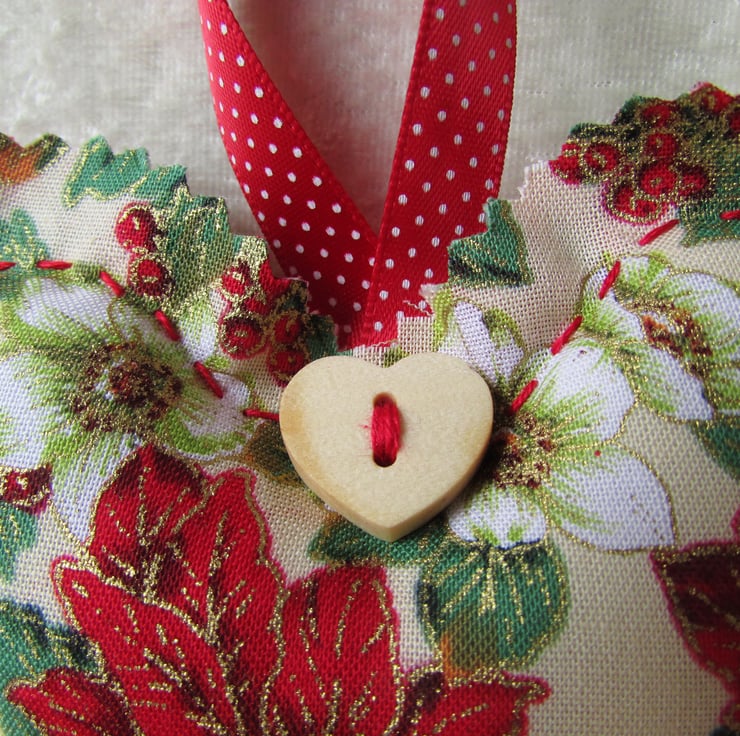 A padded Christmas decoration hanging heart made from a lovely cream fabric with a pretty green, red and gold Christmas floral print pattern. The heart is hand-stitched and the edges are pinked to give a scalloped edge. It is embellished with a wooden heart shaped button and has a red hanging ribbon with white polka dots. Size approx. 4.5" (11.5cm) high (excluding ribbon) x 4.5" (11.5cm) wide. The decoration is filled with polyester hollow fibre filling which conforms to safety regulations.