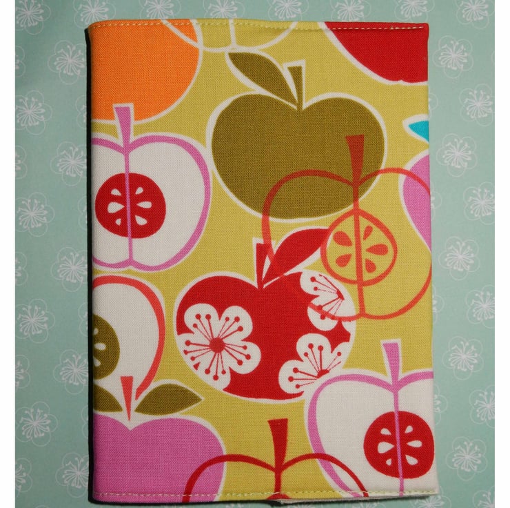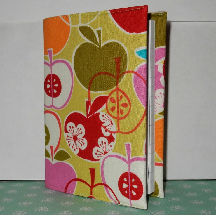 This is an A6 notebook, with lined paper,it has been covered with a bright and colourful fabric featuring apples. It is interfaced and lined in plain fabric, the cover can be removed, and a replacement notebook fitted when needed.