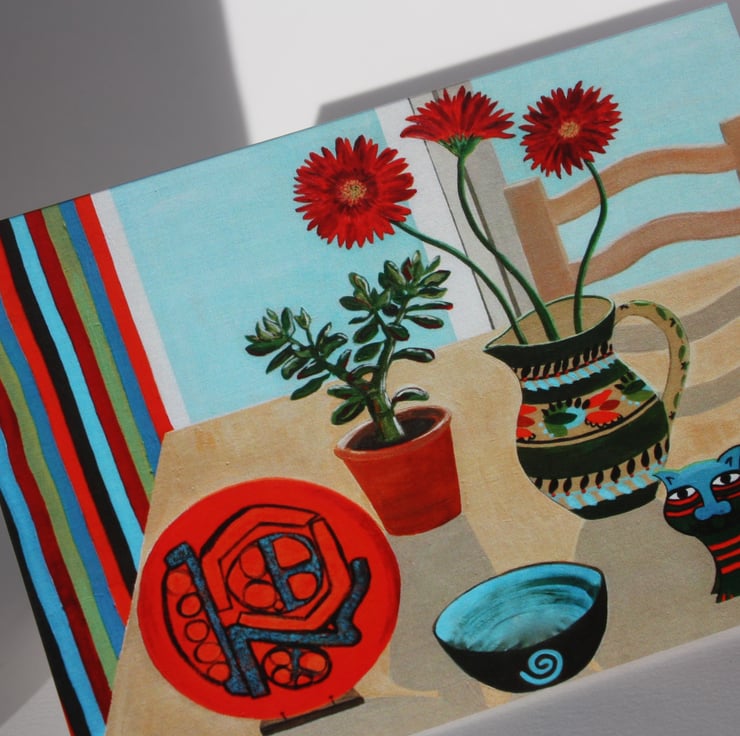 This card is a high quality reproduction of an original acrylic painting that I made of some of my favourite objects. In the style of Mary Fedden, the limited palette pulls the quirky objects together in what I hope you agree is a really pleasing study.