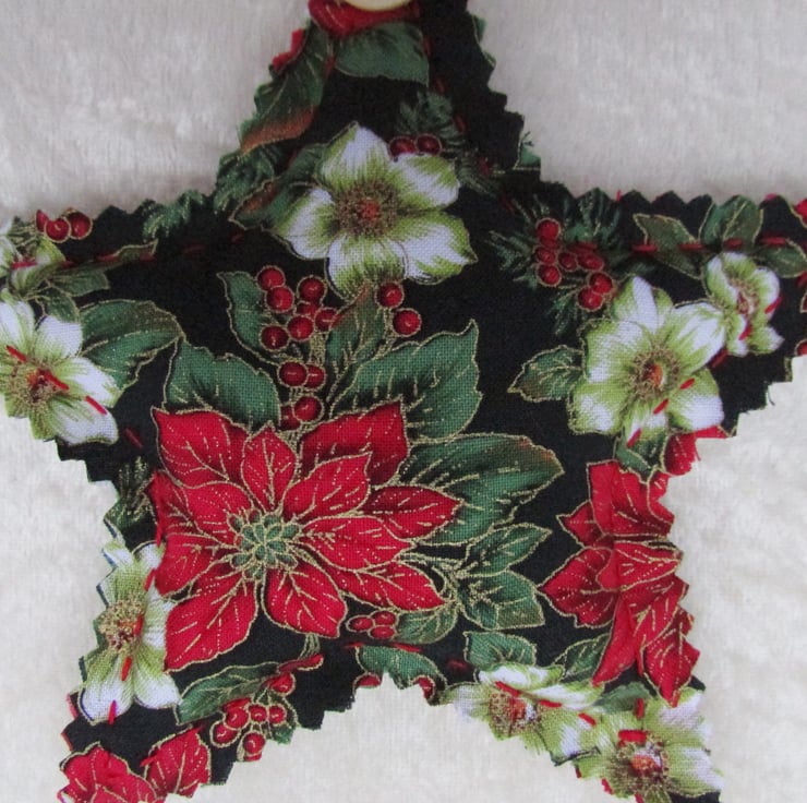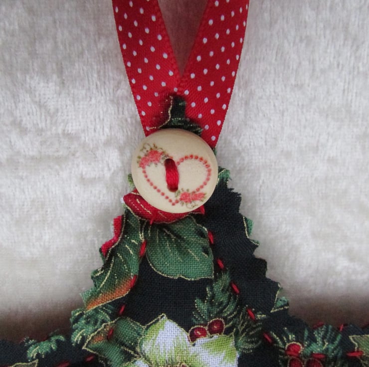 A padded Christmas decoration hanging star made from a delightful black fabric with a lovely cream, green, red and gold Christmas floral print pattern. The star is hand-stitched and the edges are pinked to give a scalloped edge. It is embellished with a round wooden patterned button and has a red hanging ribbon with white polka dots. Size approx. 5.5" (14cm) high (excluding ribbon) x 5.5" (14cm) wide. The decoration is filled with polyester hollow fibre filling which conforms to safety regulations.