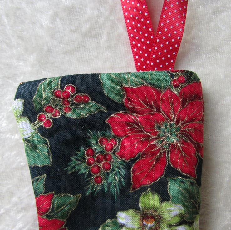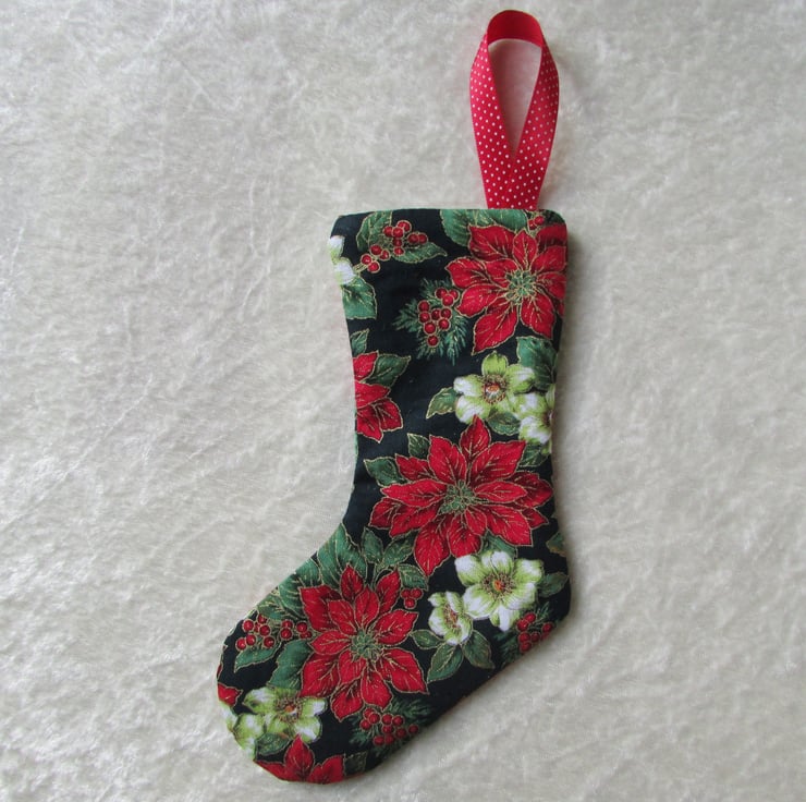 A small hanging Christmas stocking made from a lovely black fabric with a pretty green, cream and gold Christmas floral print pattern. The stocking is fully lined with cream fabric and has a red hanging ribbon with white polka dots.