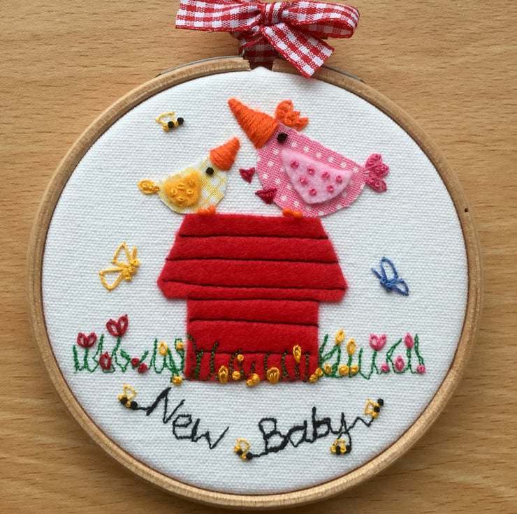 This small cute little hoop has been made using a mixture of freemachine and hand embroidery. Classic fabrics of calico, gingham and felt have been used to achieve a lovely whimsical design. Lazy daisy and french knot stitches are used for the bees and butterflies, satin stitched beaks and seed bead eyes give character to this scene.