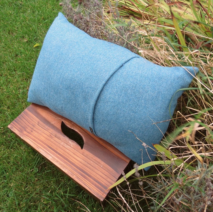 There is a deep envelope opening to the reverse of the cushion, which is the same blue wool as the front.