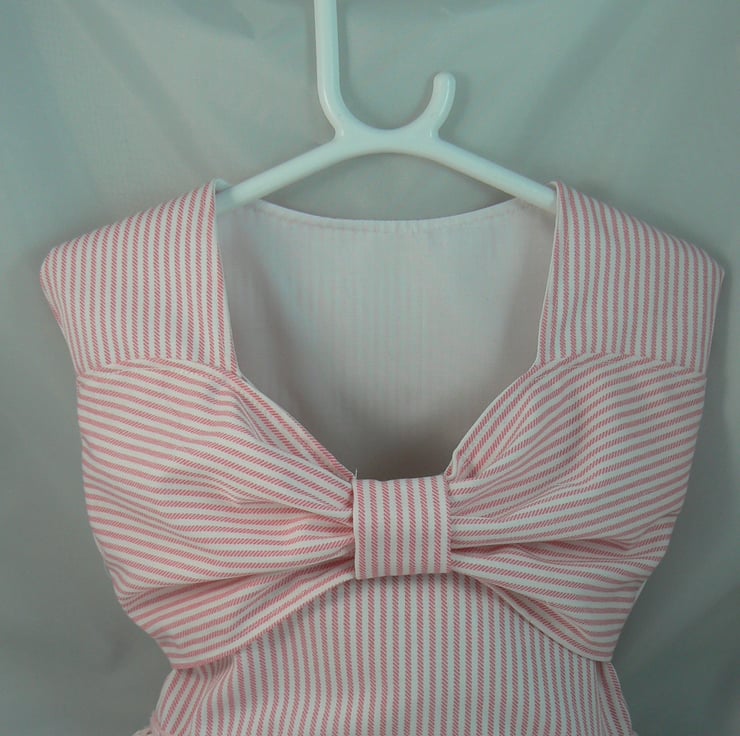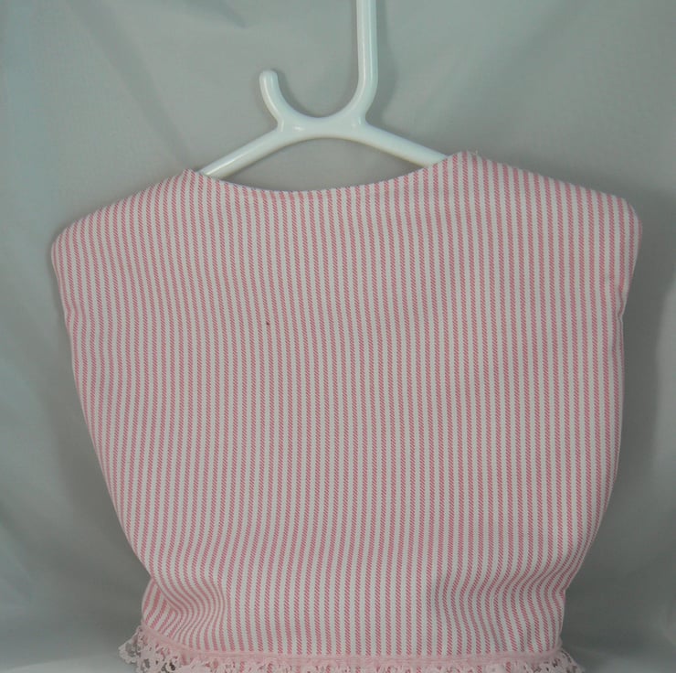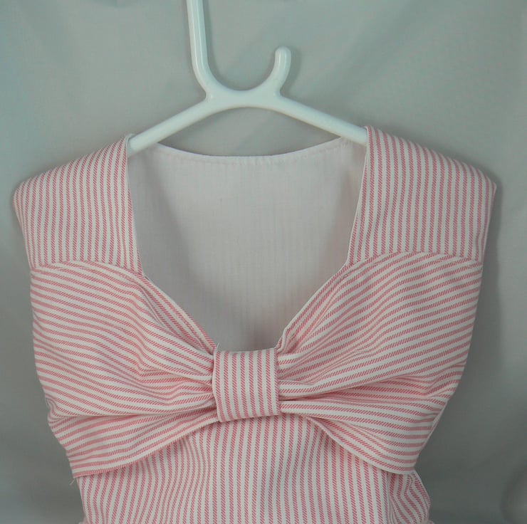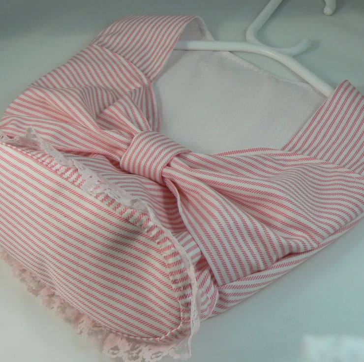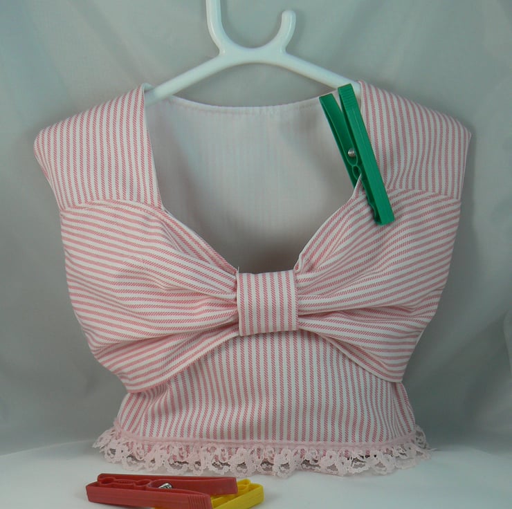 I have made this peg bag out of a strong cotton striped material and lined with white polycotton. I thought a little crop top style, with bow would look great for a peg bag. As you can see from one of the photo's I have designed it with a gusset at the bottom which makes it much easier to get the pegs out and this part has a very strong interfacing buit in. I have not used a child hanger but cut down a Adult size one as it is so much stronger (easily removed for washing)