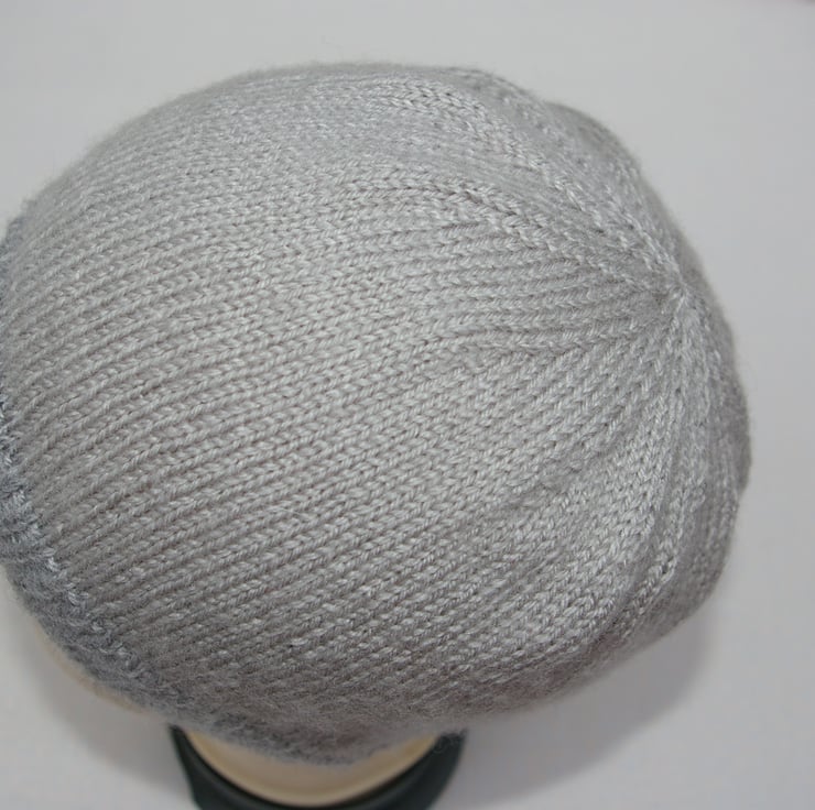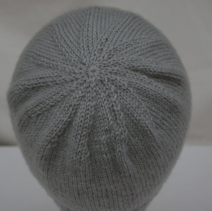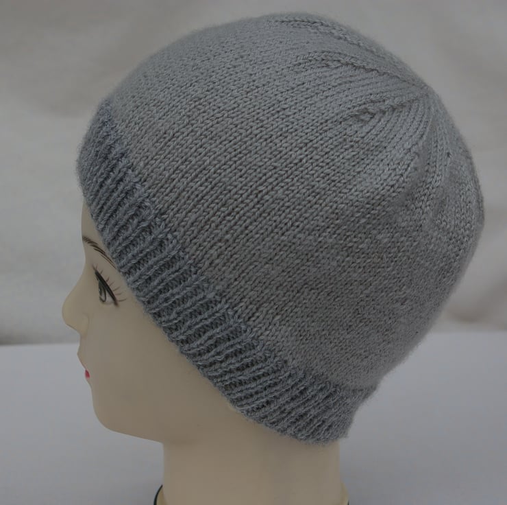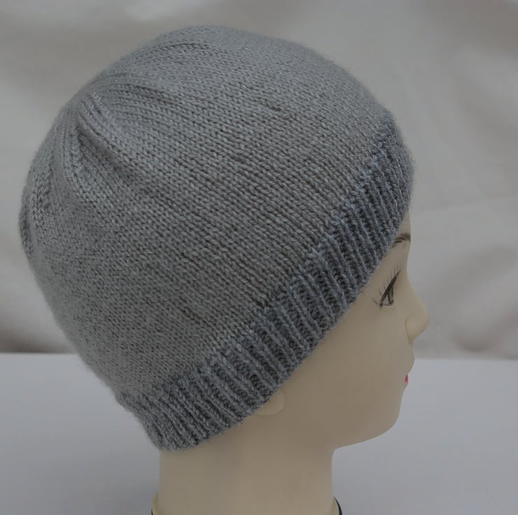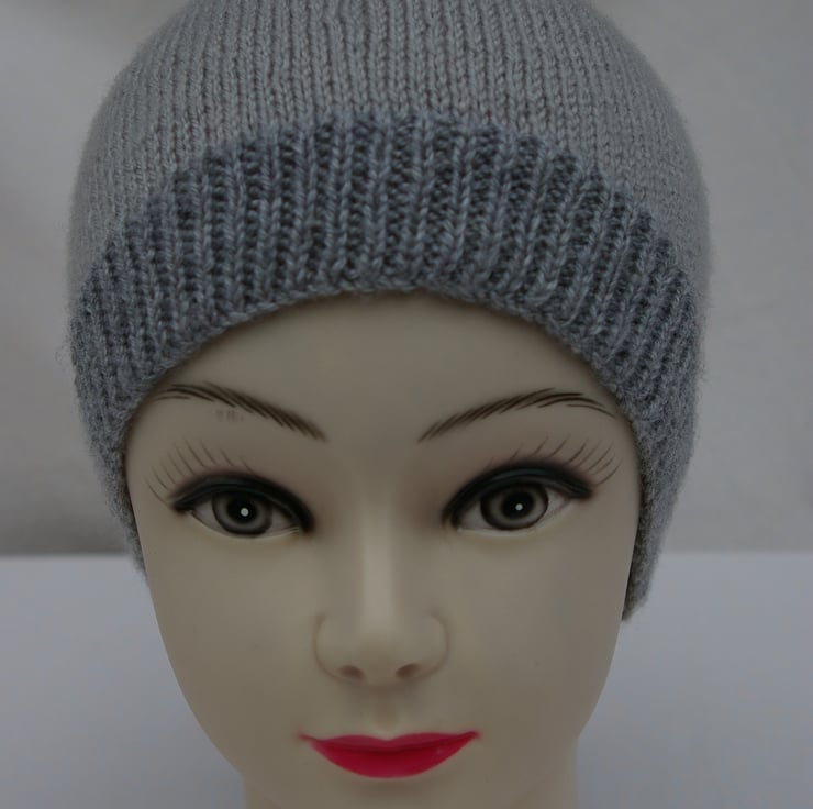 A hand knitted adult grey Beanie hat. This lovely hat has been knitted in two shades of grey in the round which means the hat is seamless. The rib of the hat has been knitted in dark grey while the body of the hat had been knitted in light grey.