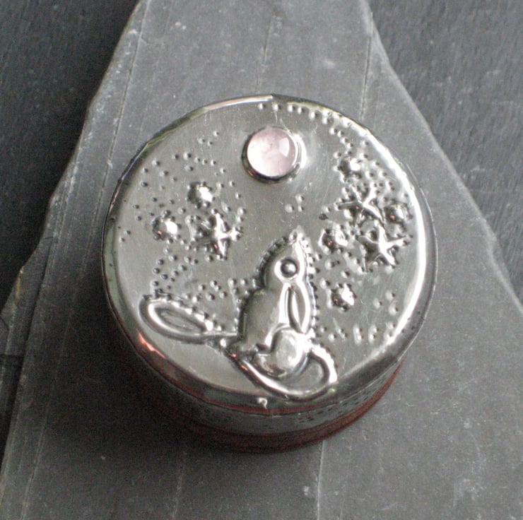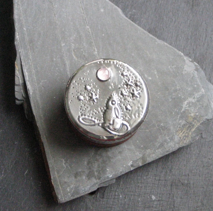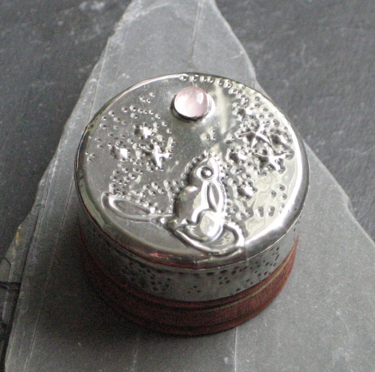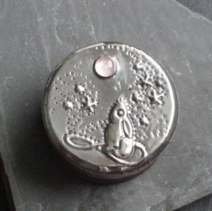 Little wooden box embellished with hare and moon. I have taken this tiny rustic wooden box and transformed it with a hand-tooled design of a mythical hare gazing up at a moon of rose quartz. Just 3cm tall by 4cm wide, it is just right for keeping tiny treasures, earrings, rings, pins and lost buttons. A pretty addition to a dressing table or bedroom shelf.