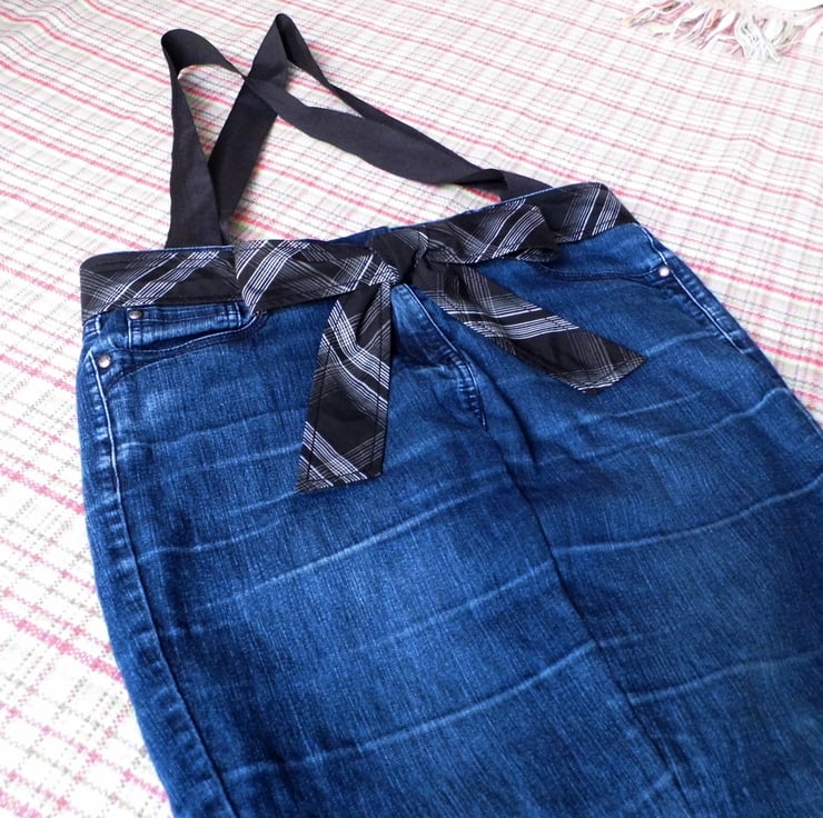 A black and white cotton material has been passed through the belt loops and tied securely into a large bow to add a pretty detail, and it is fully lined with a soft dark grey polyester cotton.