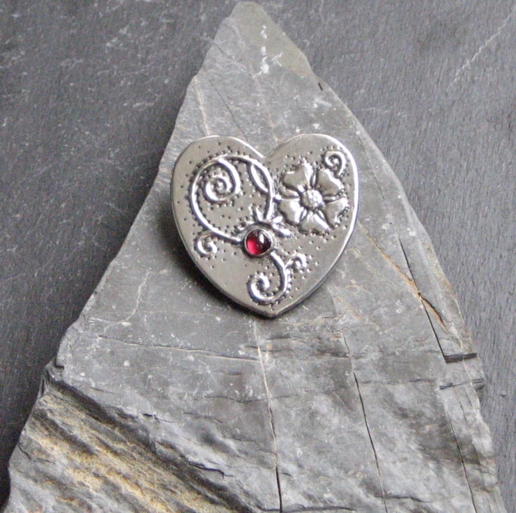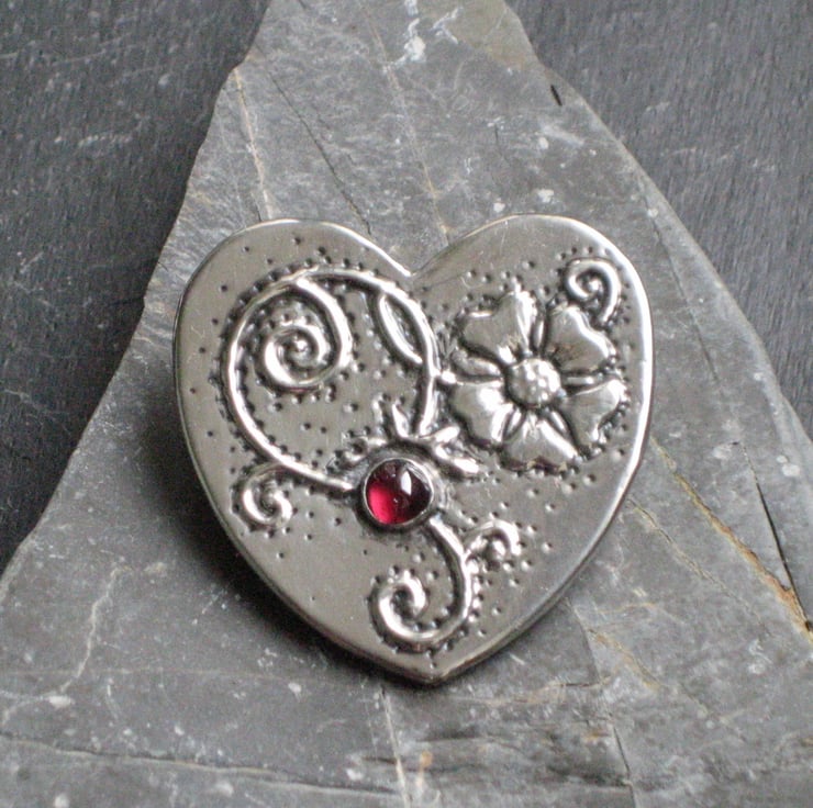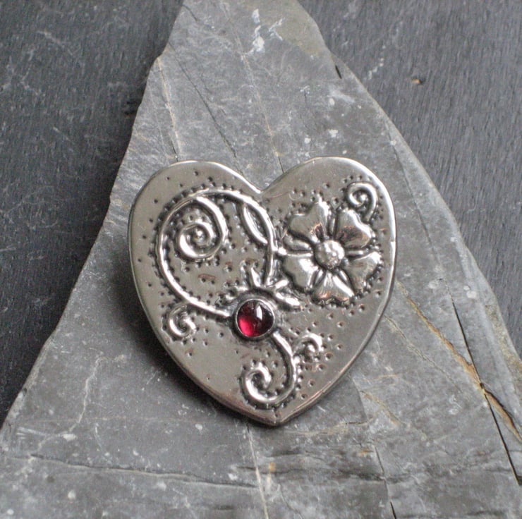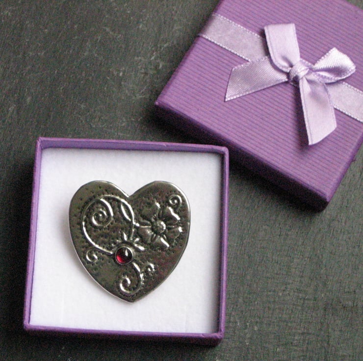 Garnet strawberry heart brooch in silver pewter. This lovely heart brooch has been decorated with a hand-tooled original design of a strawberry plant set with a beautiful deep red garnet strawberry. With a pin and safety catch on the reverse, the brooch will be sent in an attractive gift box (may differ from that shown). 39mm x 40mm in size and light in weight, so perfect for wear on all types of fabric.