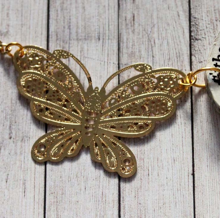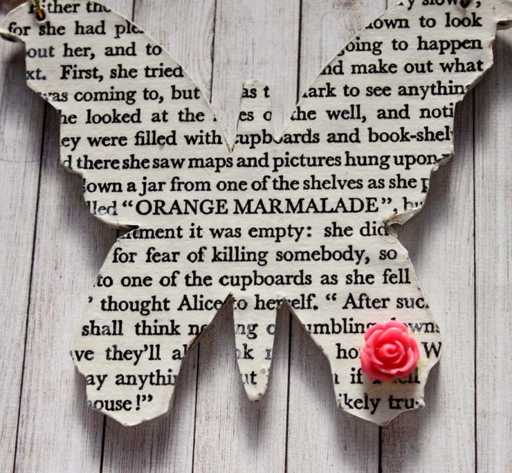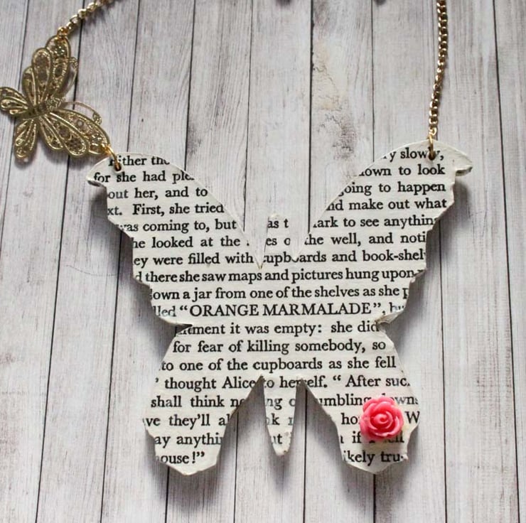 A wooden laser cut butterfly has been decoupaged with a page from the wonderful 'Alice in Wonderland'. The paper has been seals with mod podge. A great piece for Book lovers, Alice lovers, Butterfly lovers. It's the necklace for everyone!