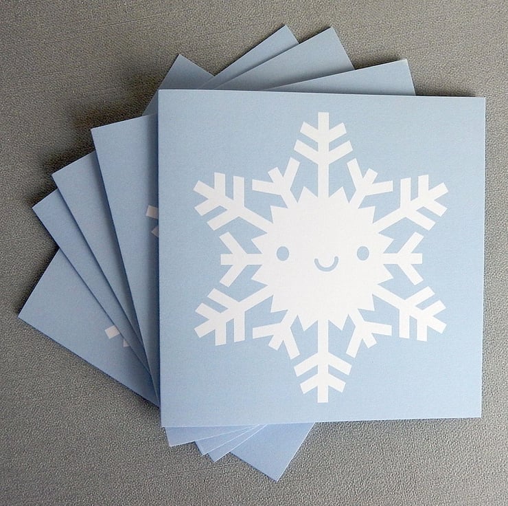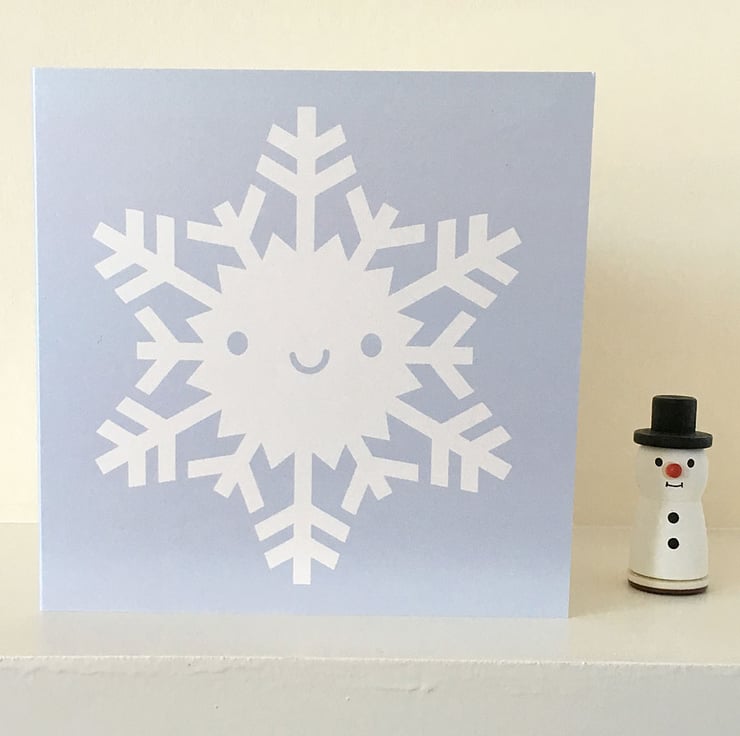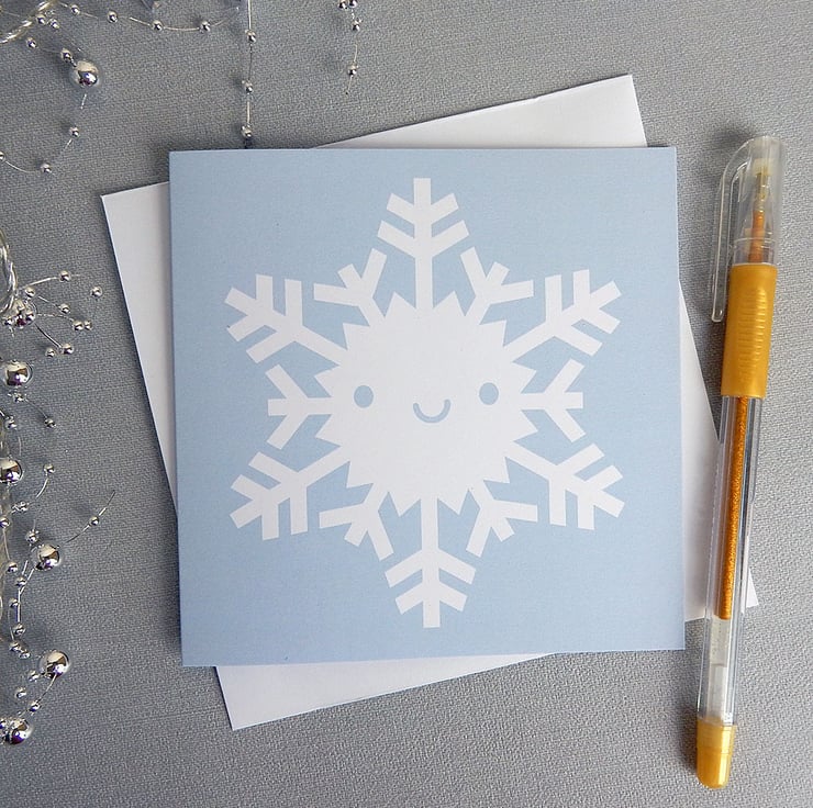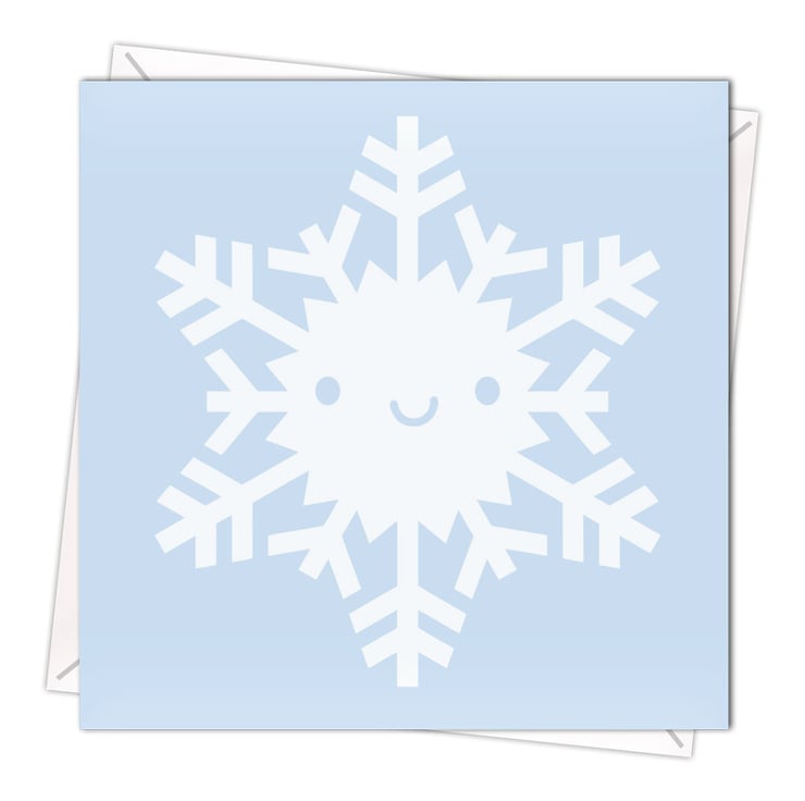 This cute card features my happy kawaii snowflake against a blue background. It's great for a Christmas card or general winter-time greetings. Design is professionally printed on a 100% recycled white card with matching white envelope. Blank inside for your own message.