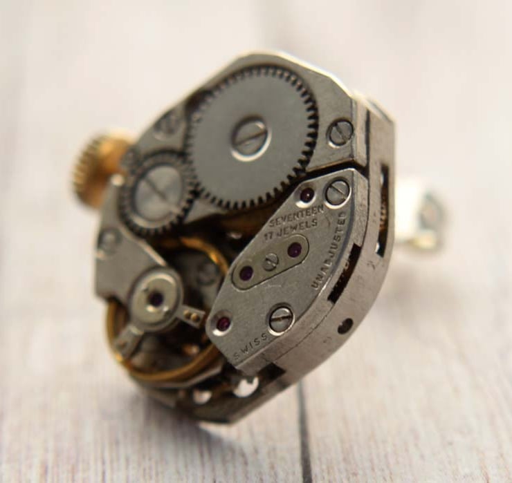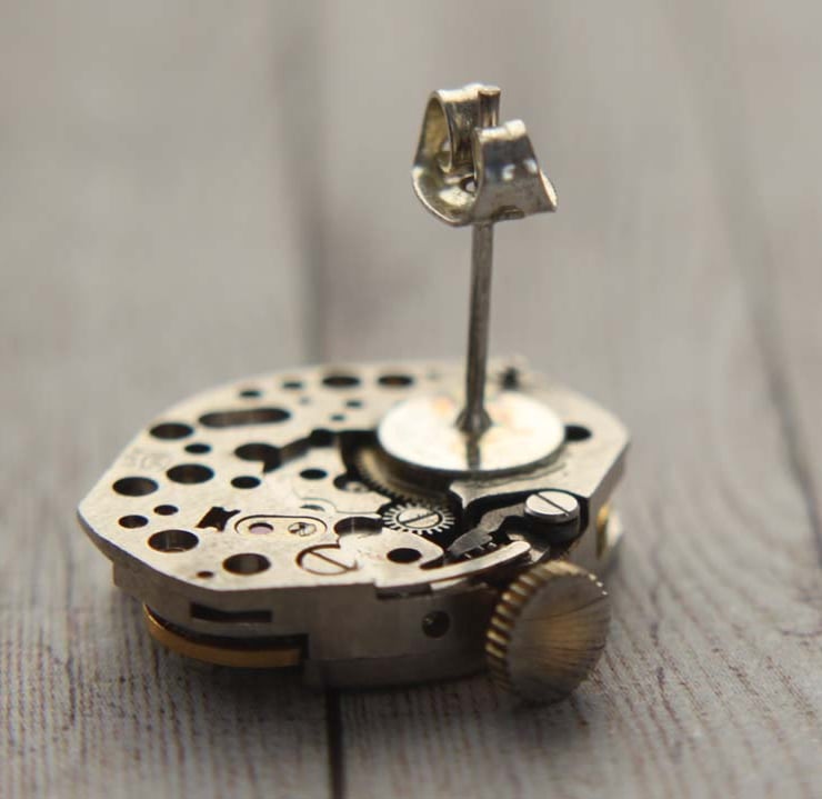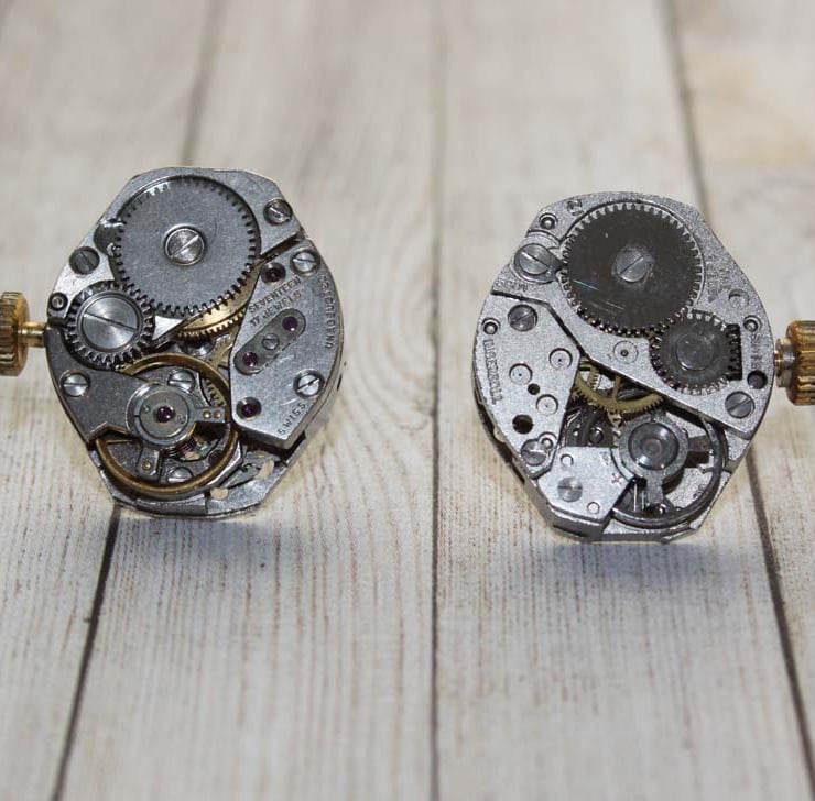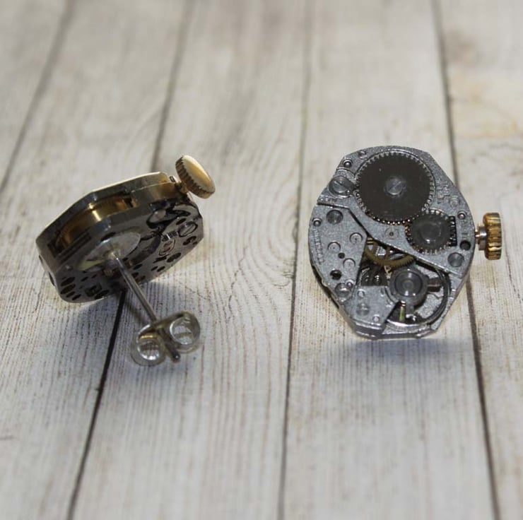 Vintage ladies wristwatch movements have been repurposed into a pair of steampunk inspired stud earrings.