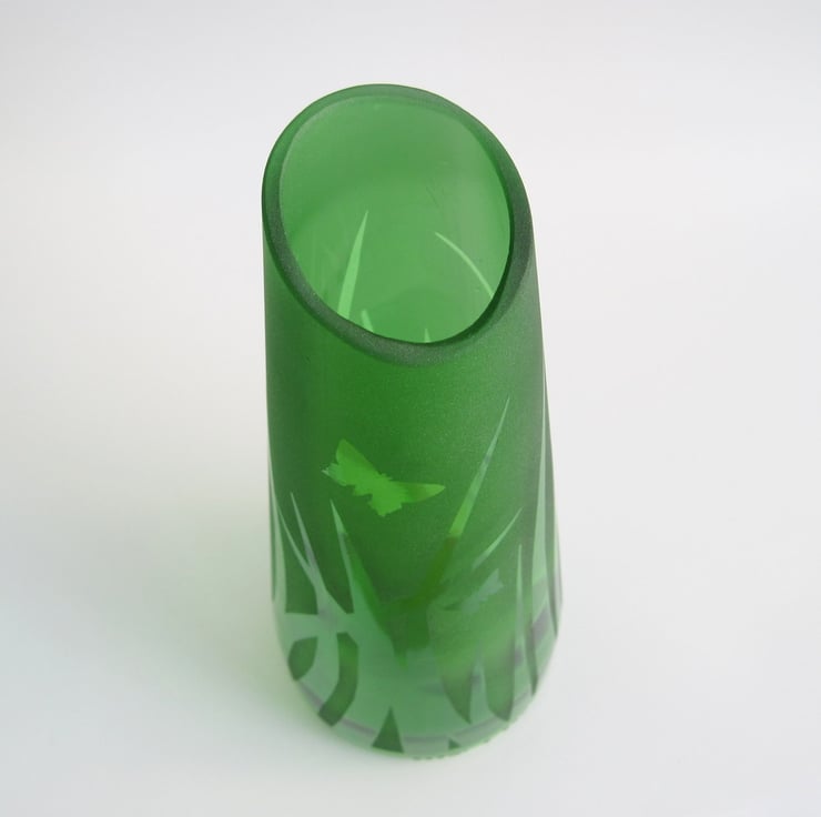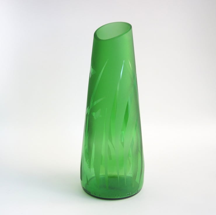 I took advantage of the unusual tapering shape of the bottle by cutting the top off at an angle before polishing the edges until smooth. Then I sandblasted the bottle leaving a design of butterflies amid long waving blades of grass.