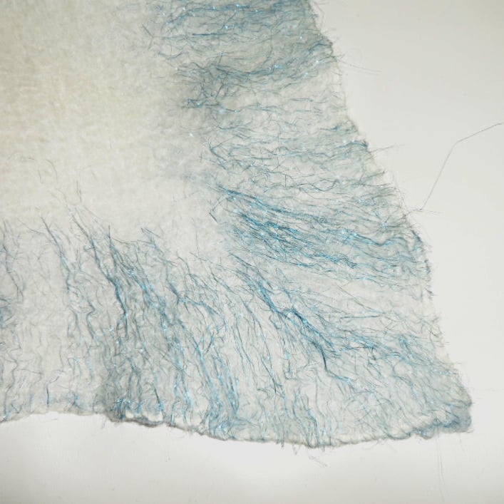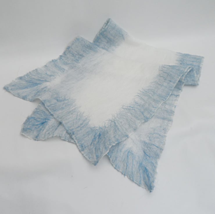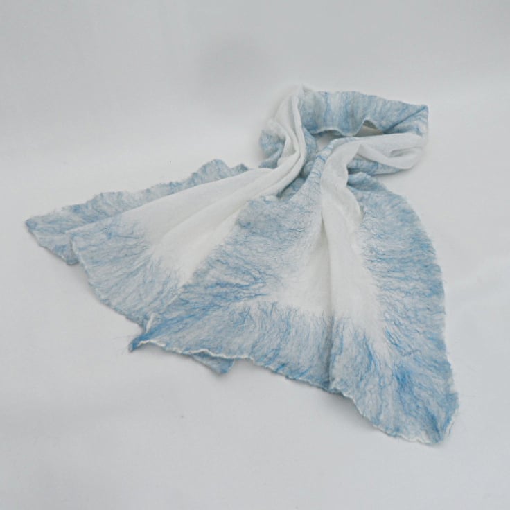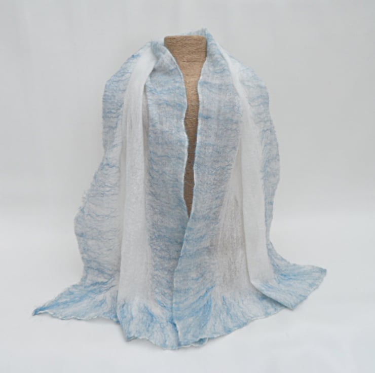 This scarf has been made using a very fine layer of beautifully soft merino wool nuno felted to both sides of a silk chiffon scarf. A blend of white merino wool and blue stellina (made from polyester and nylon) glittery fibre has been added around the edges to create a border with a touch of sparkle. The fineness of the woollen layers results in a lightweight yet soft and warm scarf that drapes beautifully.