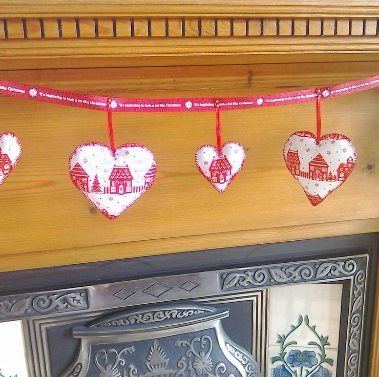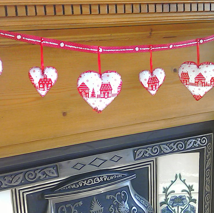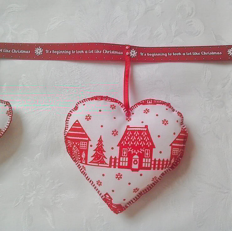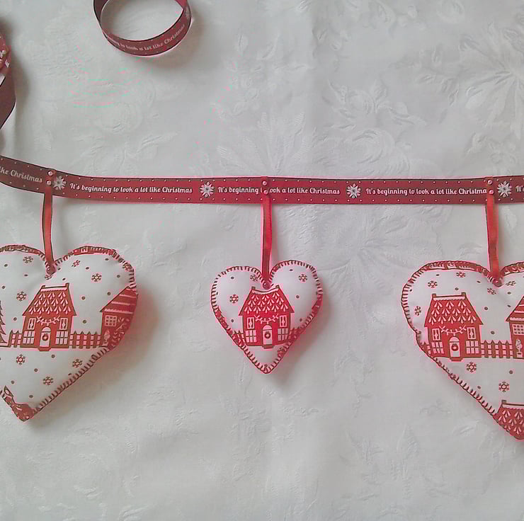 There are 7 hearts all hand stitched edged in blanket stitch and filled with polyester toy filling. Each heart is hanging on a red ribbon, with the words "it's beginning to look a lot like Christmas" written along. Attached by a thin ribbon with small red and white beads.