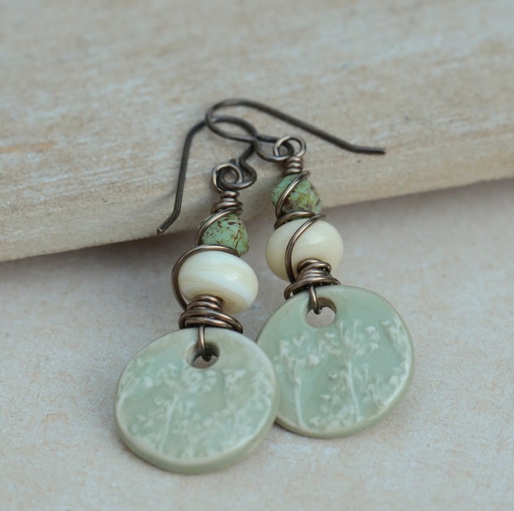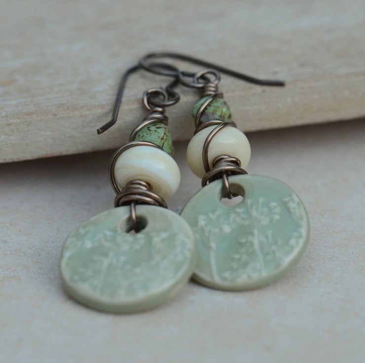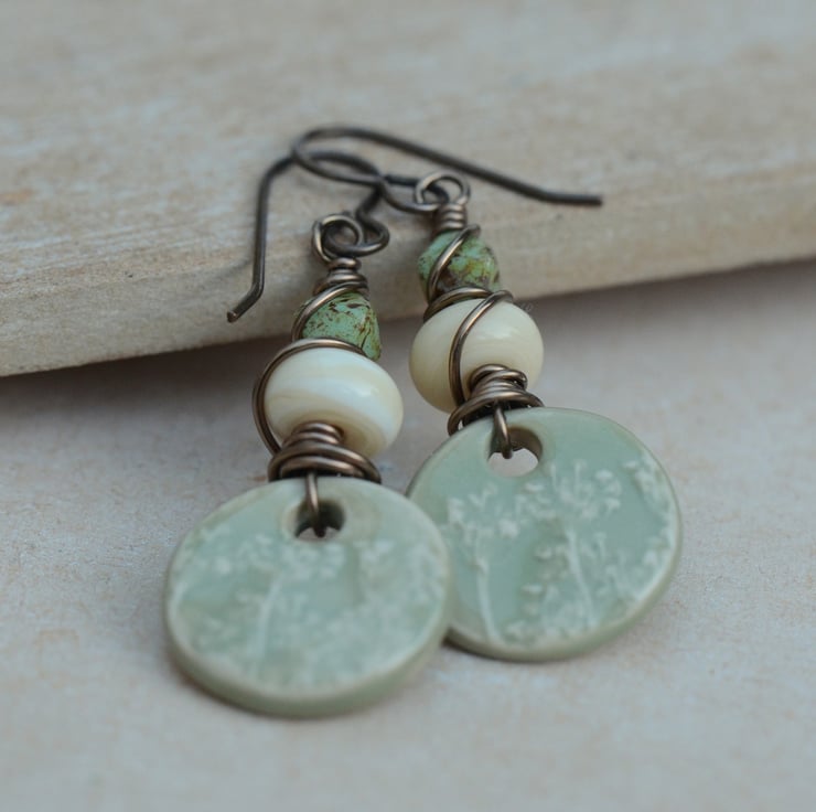 I have used pale green ceramic coriander seed charms as the focal for these earrings which I have teamed with cream lampwork glass beads and green Picasso finish Czech bicone glass beads wire wrapped with bronze plated wire on bronze earwires.