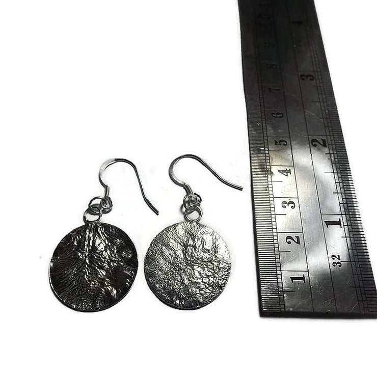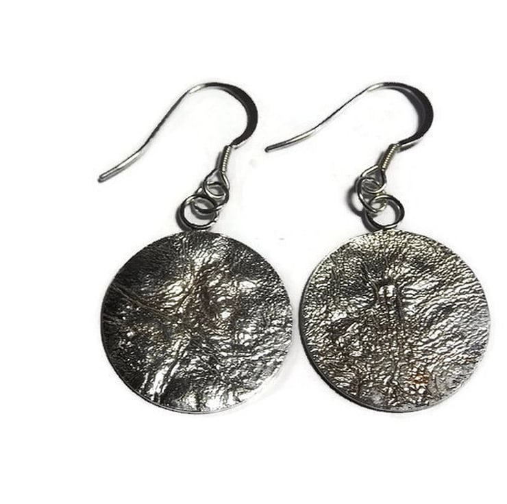 An elegant pair of modern earrings featuring two discs or reticulated sterling silver. Reticulation is heating silver with a flame to create a unique texture