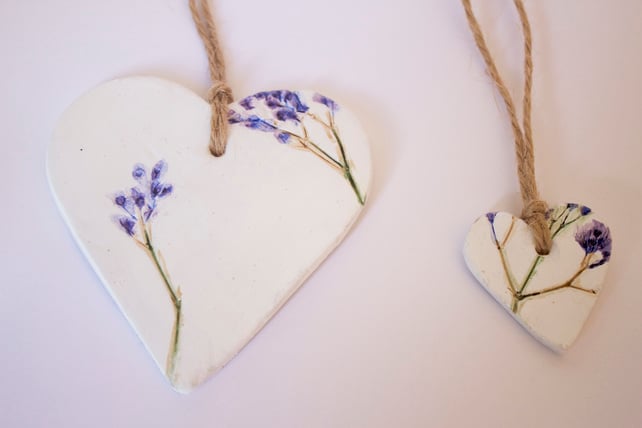 A set of three pretty hanging hearts of different sizes, decorated with an imprint of flowers and then hand painted using a mixture of water colour and acrylic paints. Varnished and suitable for outdoors. Colours are mixed and layered to produce a pretty effect.