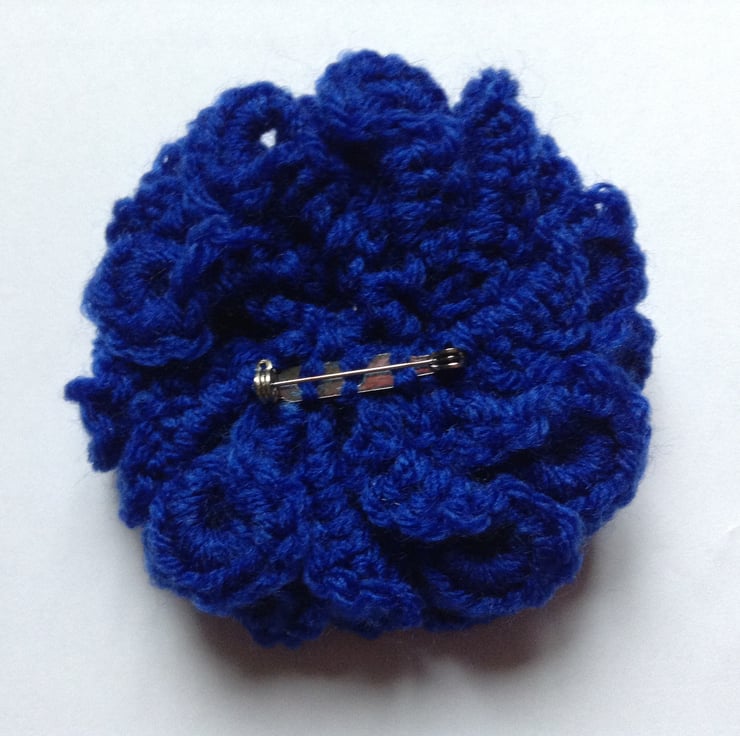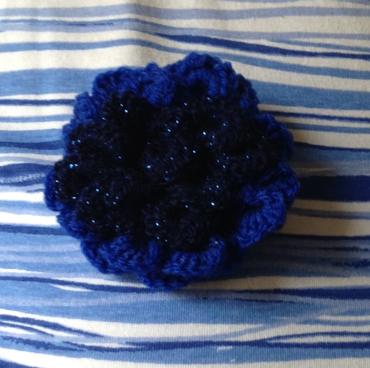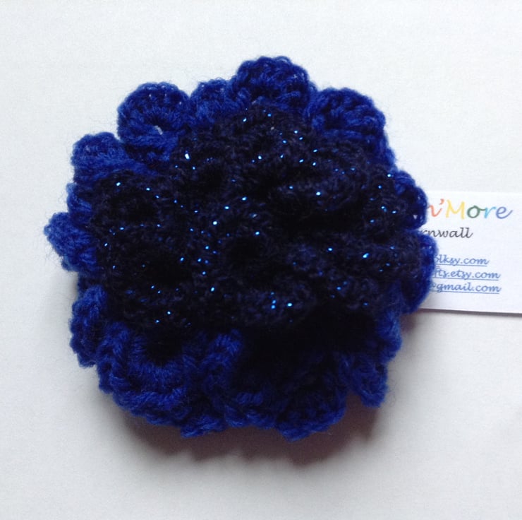 Hand crocheted brooch in an acrylic yarn. Flower petals are in the form of 2 layers of loops. The outer layer is in Royal blue, the inner layer is Navy blue with a Royal blue metallic thread for added sparkle.