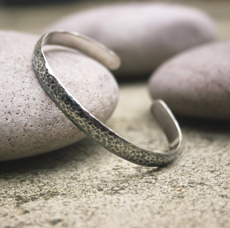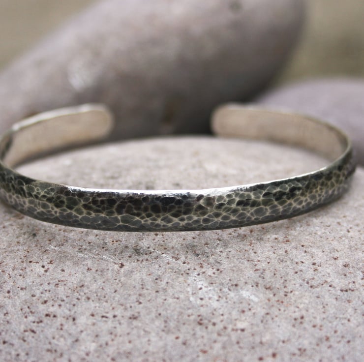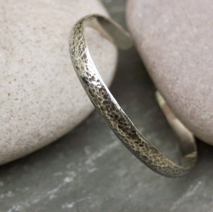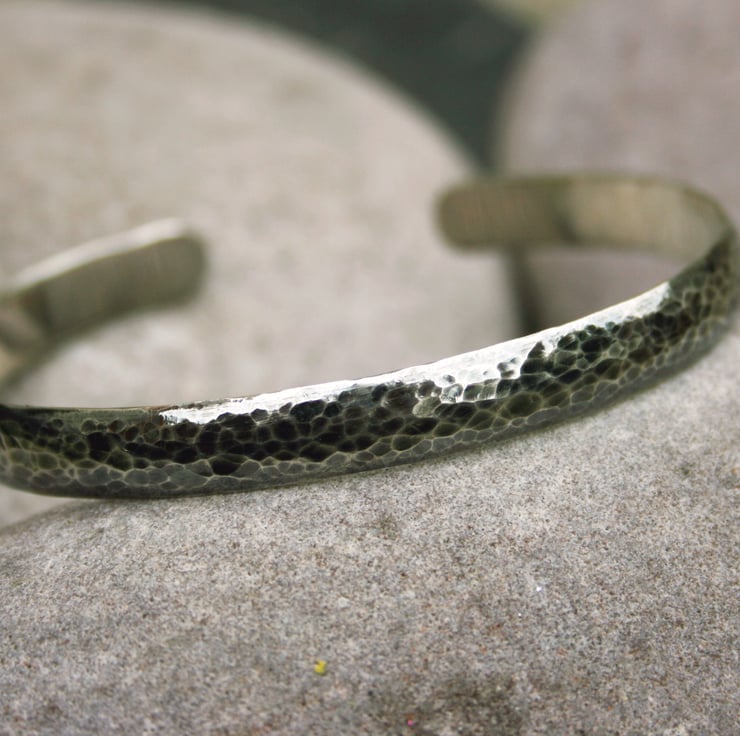 The hammered surface of the bangle has been oxidised and polished creating an interesting flecked pattern.