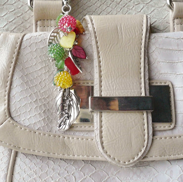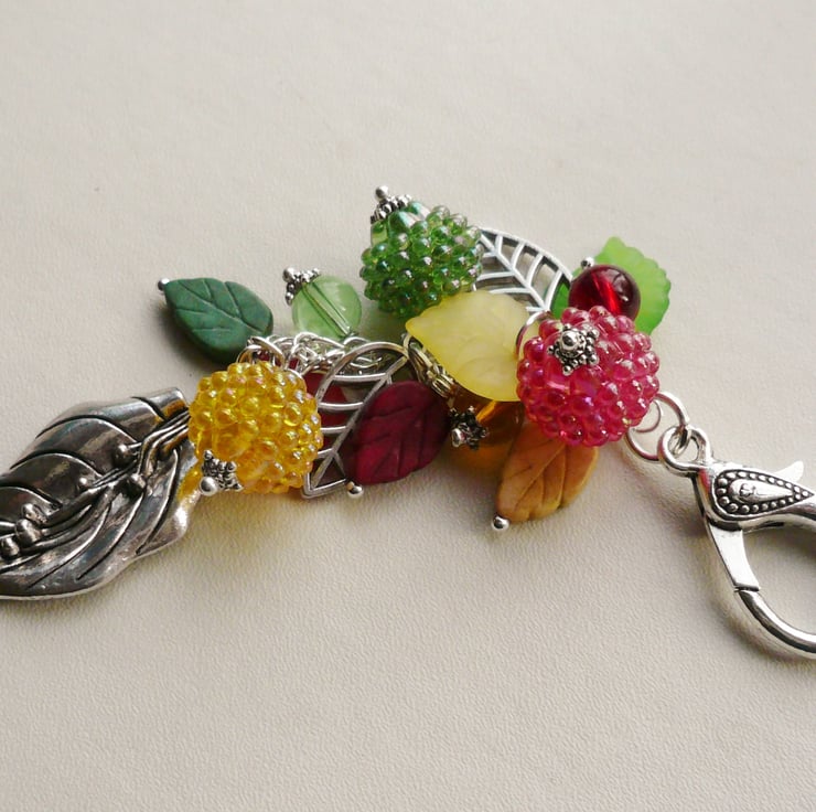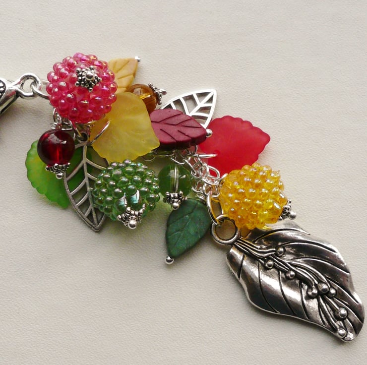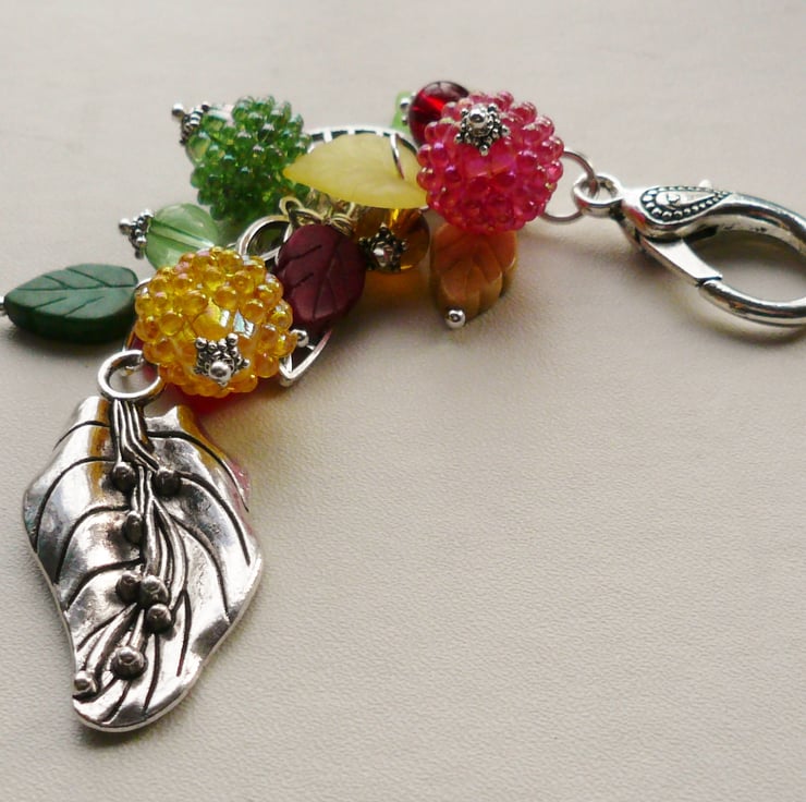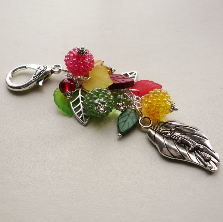 This pretty autumnal themed handbag charm is made up of a collection of 15mm round acrylic berry beads, 15mm lucite leaves, 12mm long Howlite leaf beads and 8mm round clear glass beads all in co-ordinating warm and fruity autumnal colours of red, yellow and green. Also includes 20mm Tibetan silver leaves and a 40mm long Tibetan silver leaf pendant hanging below. All attached to a silver plated chain with a 30mm trigger clasp fastener.