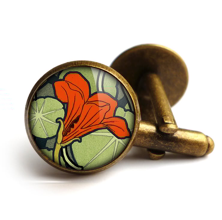A beautiful pair of cufflinks featuring an art nouveau illustration of a vibrant nasturtium flower. This design is part of the 'Art Nouveau' range.