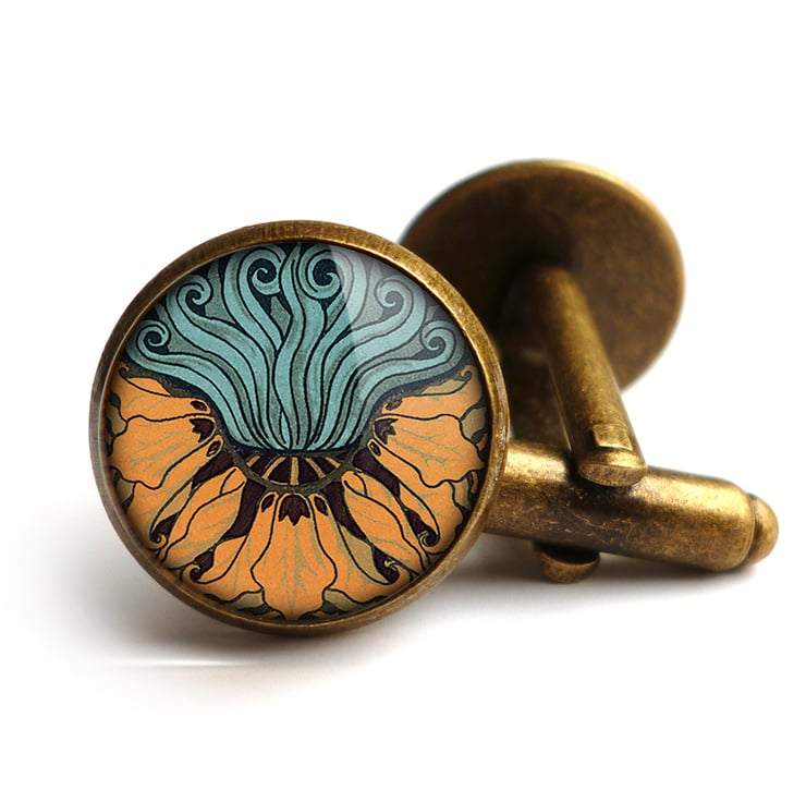 A beautiful pair of cufflinks featuring an art nouveau illustration of a crown imperial fritillary flower. This design is part of the 'Art Nouveau' range.