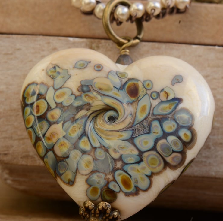 The lampwork heart is handmade by UK Artist Joanne Joyce and is approx. 3cm / 1 1/4 inches. The heart has a cream opaque base with colours of grey, brown, blue and green.