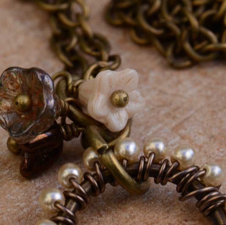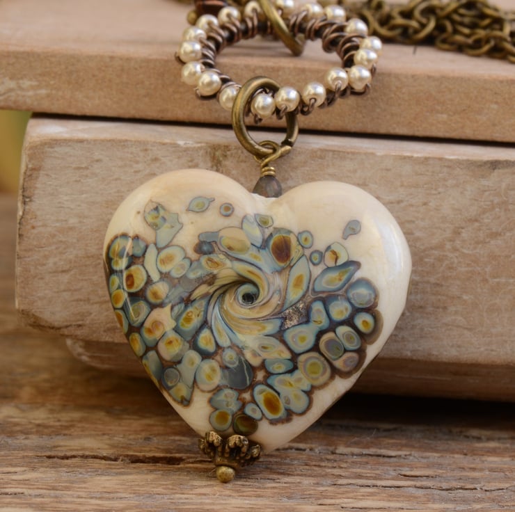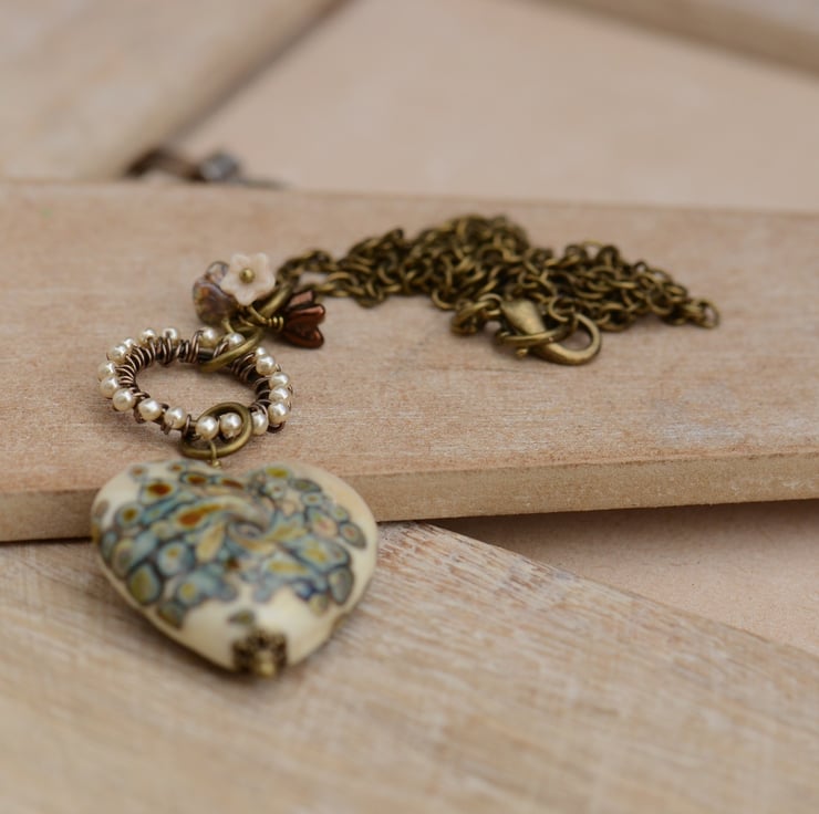 A beautiful cream lampwork glass heart bead is the focal for this necklace which I have teamed with a beaded ring of tiny cream glass pearls, a little cluster of Czech flower cup beads in shades of cream and brown/bronze finished on antique bronze plated chain with trigger clasp to close.