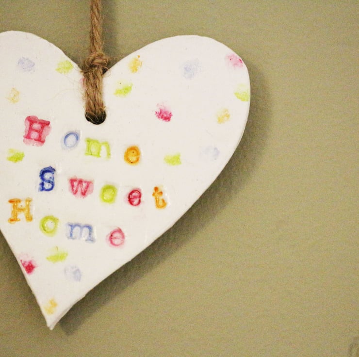A pretty heart with the words 'Home Sweet Home' hand stamped into the clay before drying. Then a mixture of acrylic and water colour paint is used.