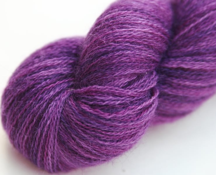 Semi-solid/slightly variegated purple with a little pink. This lustrous, lofty and slightly fuzzy yarn should make beautiful lace projects. Photographs have been taken and edited in brightish but wintery natural light.