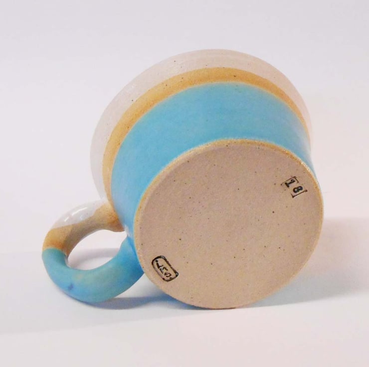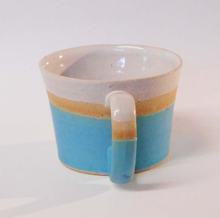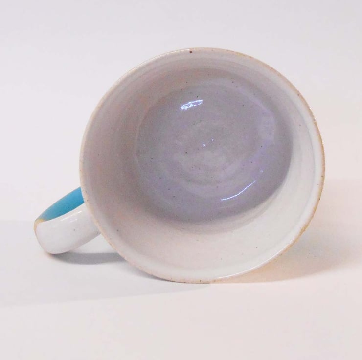 This is a one off unique wheel thrown stoneware ceramic mug. It is handmade, and hand painted, so finishes and colours do vary. The satin finish Turquoise blue glaze and the off white clay body has a speckled texture.