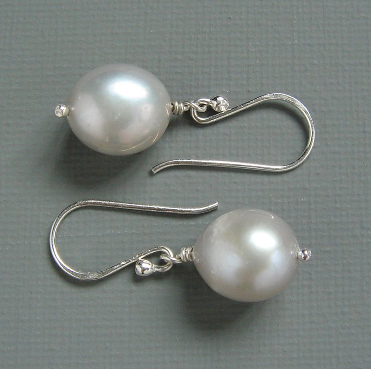 I'm very excited to bring you these classic pearl drop earrings made using truly beautiful dove grey freshwater pearls with a rainbow sheen. Not only are these pearls perfectly oval shaped but they are also large at 8 mm or just shy of 1/2" in length. They are mounted to move gracefully on my hand crafted silver wire fish-hooks and come carefully packaged in their own gift box.