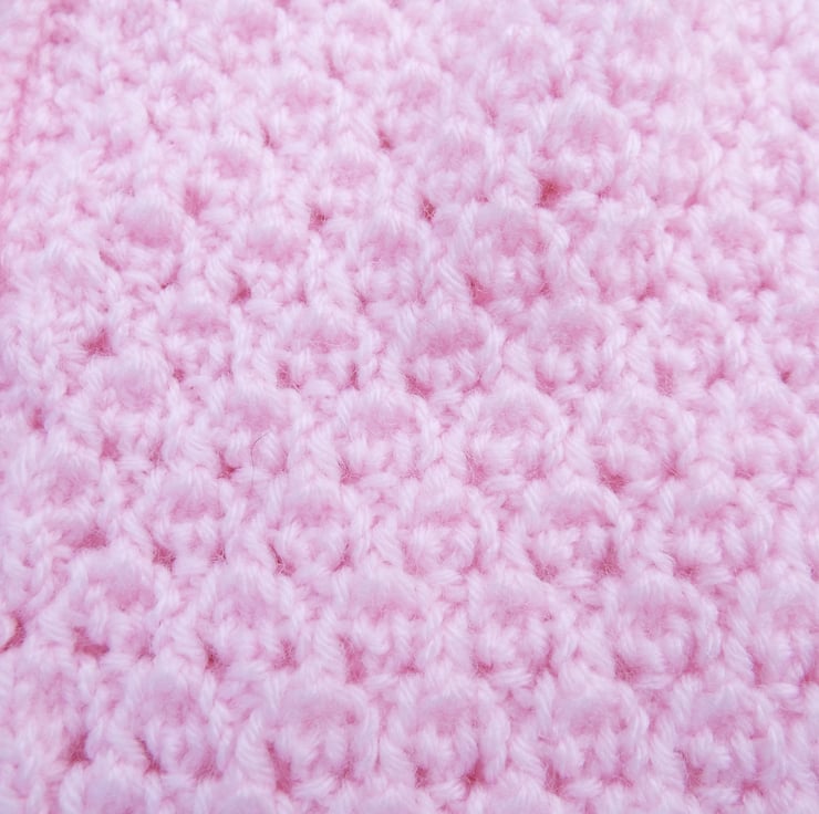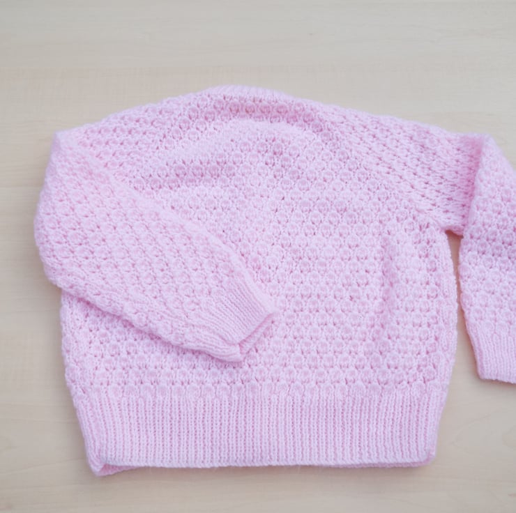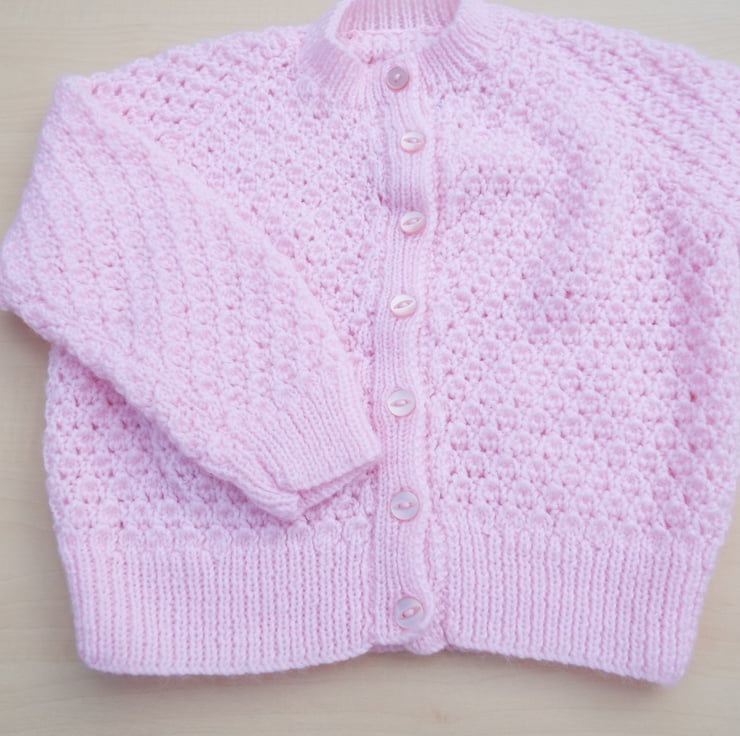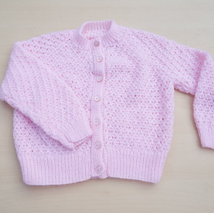 This baby cardigan has been hand knitted in a lovely pale pink and has an all over textured pattern. It has a round neckline and fastens down the front with pale pink buttons.