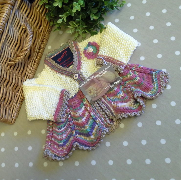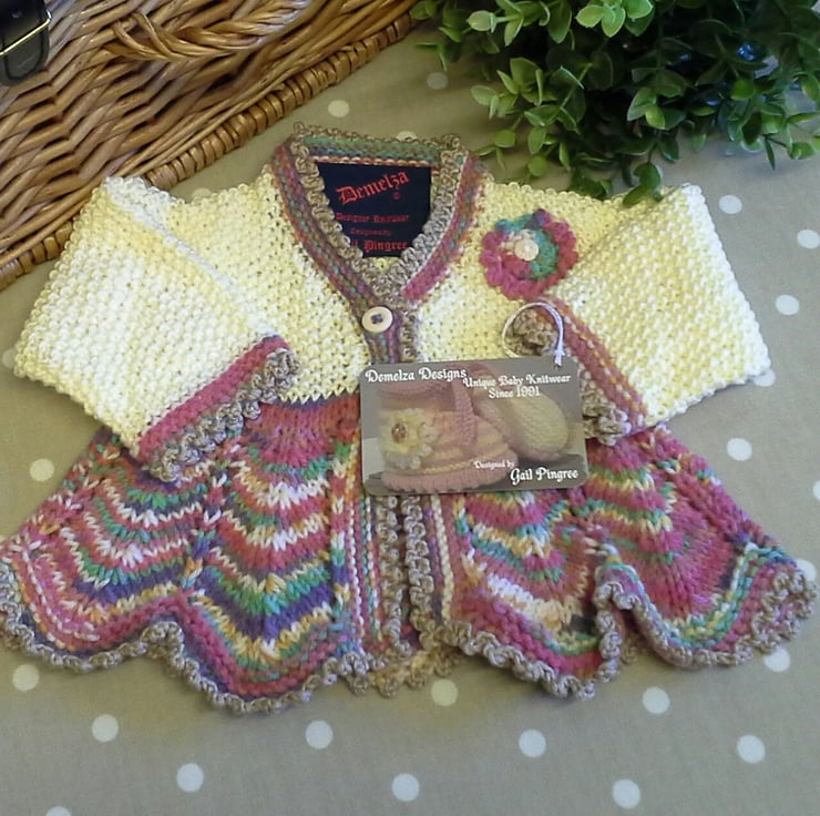 This beautiful little girls matinee jacket is from my new 'Angel' collection which I have designed and hand created. The garment is made from a quality branded British manufactured super soft silky machine washable baby yarns. To finish off the design I have hand crocheted around the lower part and sleeves of the garment with a delicate picot edge trim in a silky soft contrasting yarn. The sleeves are extra wide giving room for under garments and room for little one to move her arms without feeling restricted.