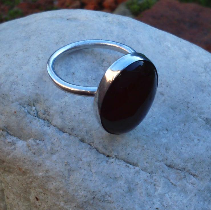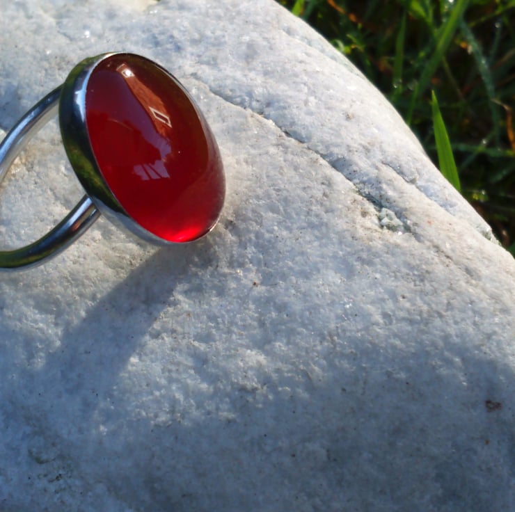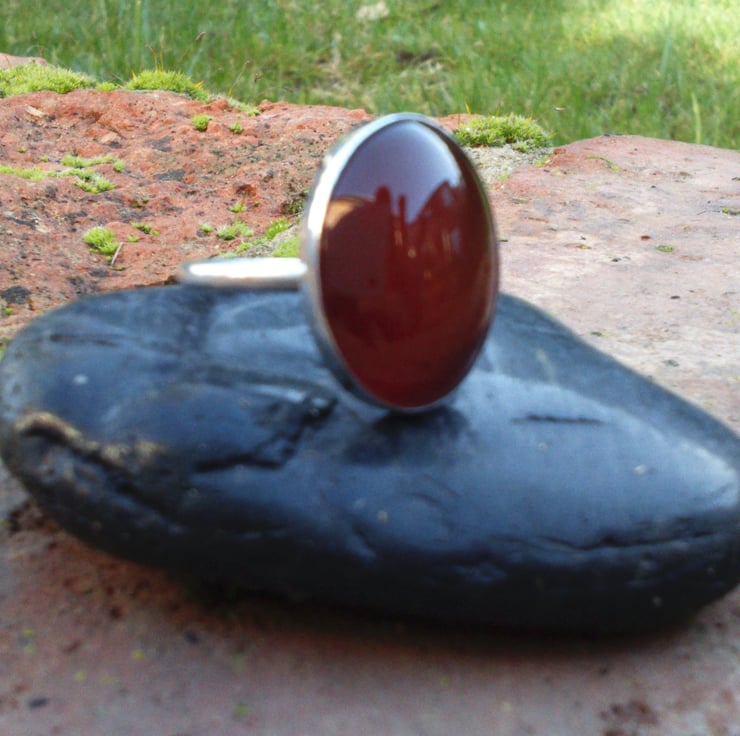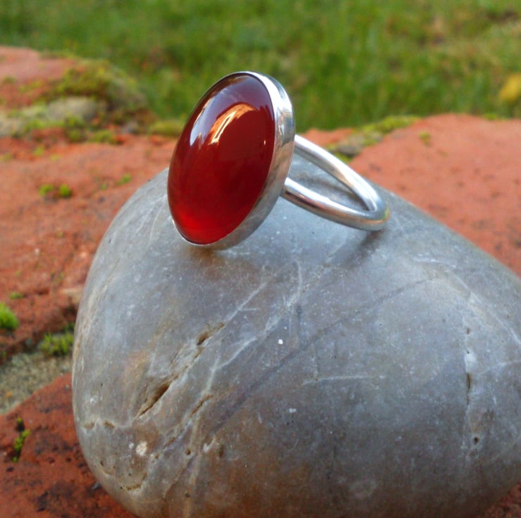 Sterling silver ring set with a beautiful oval carnelian cabochon. The carnelian measures 18x13mm in size.