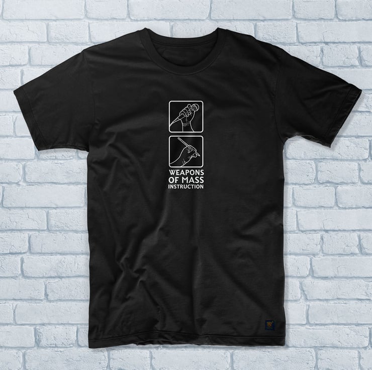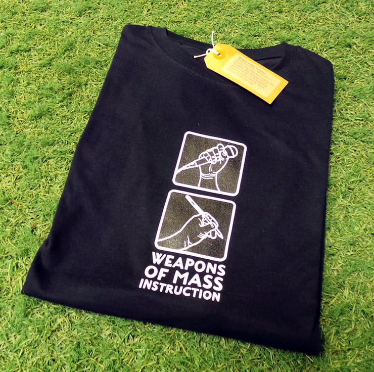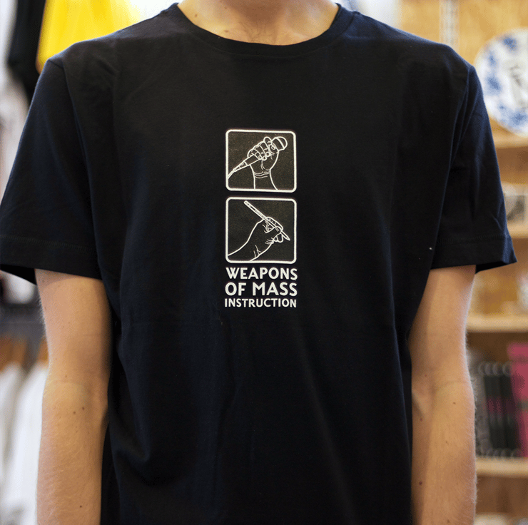 uchi clothings twelfth T shirt is still a popular favourite. Featuring the pen and microphone and and the slogan "Weapons of Mass Instruction" which is typeset in Enola Gay - a typeface created from the lettering on the side of B-29 Superfortress bomber that dropped "Little Boy", the first atomic bomb ever used in war.
