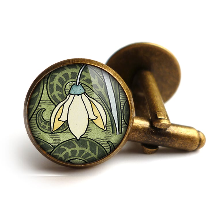 A beautiful pair of cufflinks featuring an art nouveau illustration of a snowdrop flower. This design is part of the 'Art Nouveau' range.