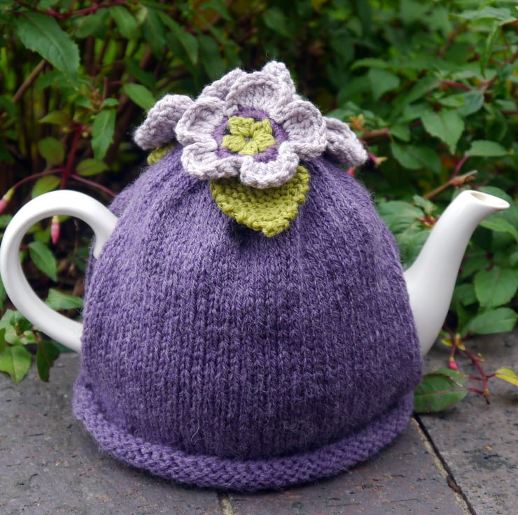 Made with dusky shades of mauve and purple, this hand knitted tea cosy will look beautiful on the breakfast table.
