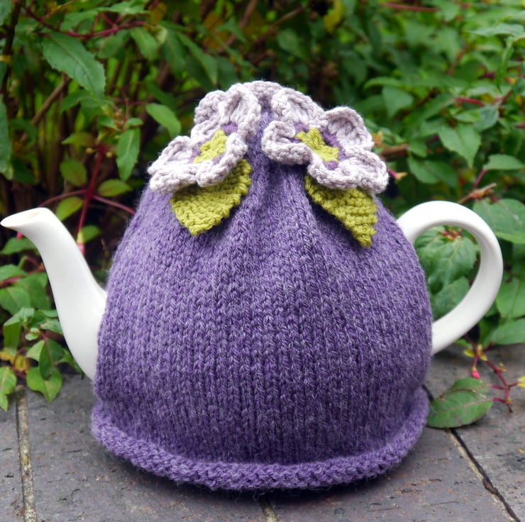 It has three crocheted flowers attached. Made with lovely soft wool/acrylic mix yarn. Will fit a standard 4 - 6 cup (1 litre) teapot and is fairly stretchy to accommodate several different styles of teapot.