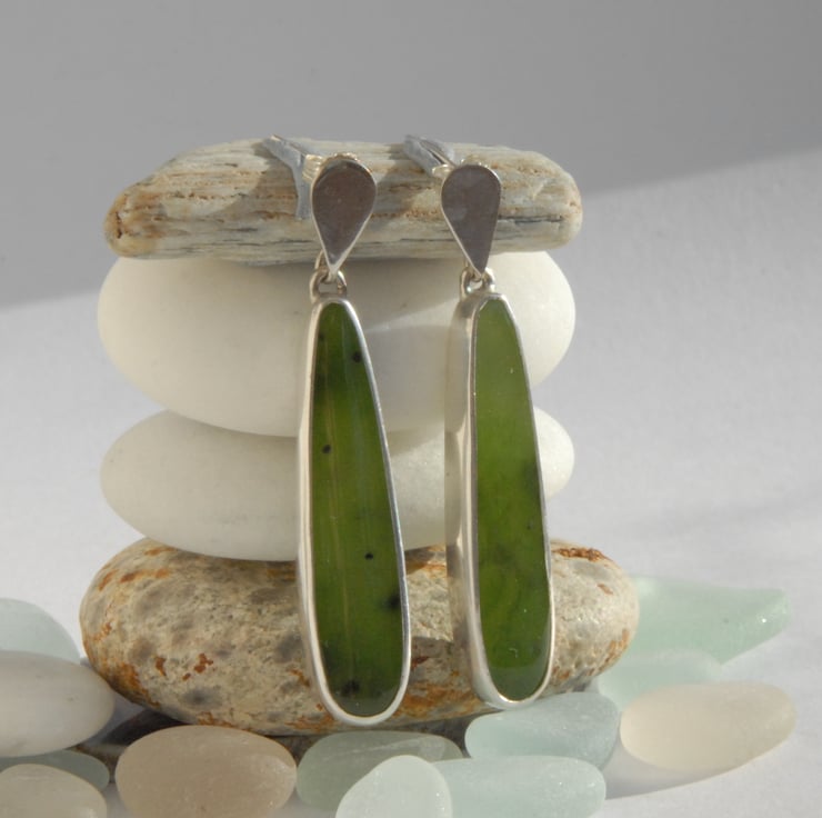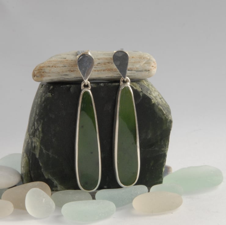 I was lucky enough to go to New Zealand and whilst on the south island I felt I had to track down some local jade (a lot of it is imported from Canada). These stones were cut and polished by Kurtis Bell who recommended a few beaches to go looking for jade and other stones on. The green rock that the earrings are resting on is pounamu from Anita's Bay that I was given by a Maori.