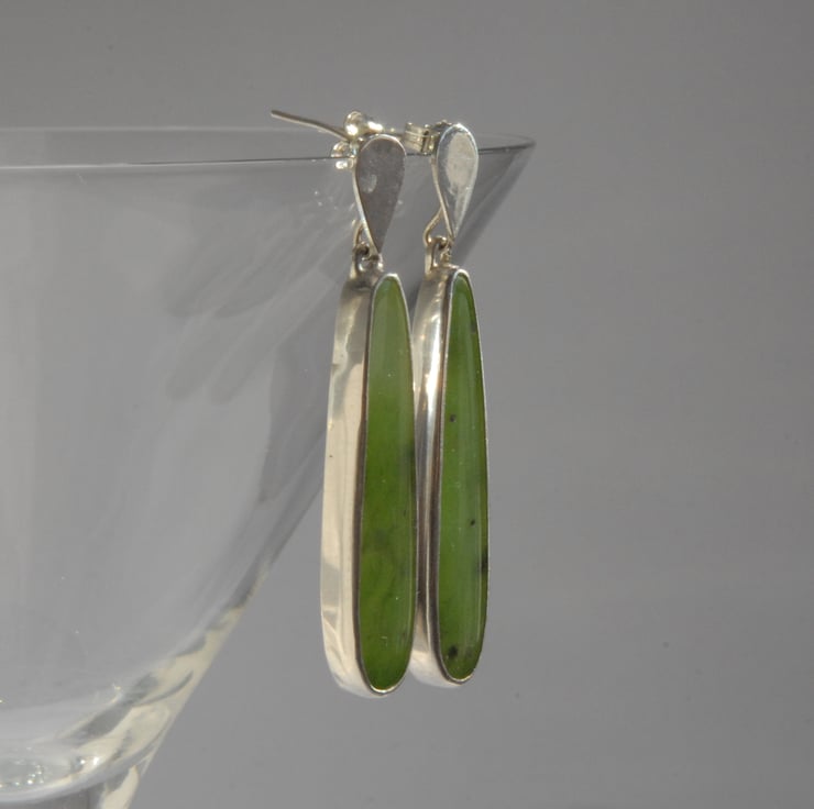 These earrings feature highly polished drops of apple green New Zealand jade bezel set in sterling silver with an open back to allow light through the stone. The shape of the jade is mimicked in the sterling silver stud tops and scrolls. The jade has occasional black flecks and a high shine - I have another similar pair of earrings where the jade as a matt finish and you can see those here