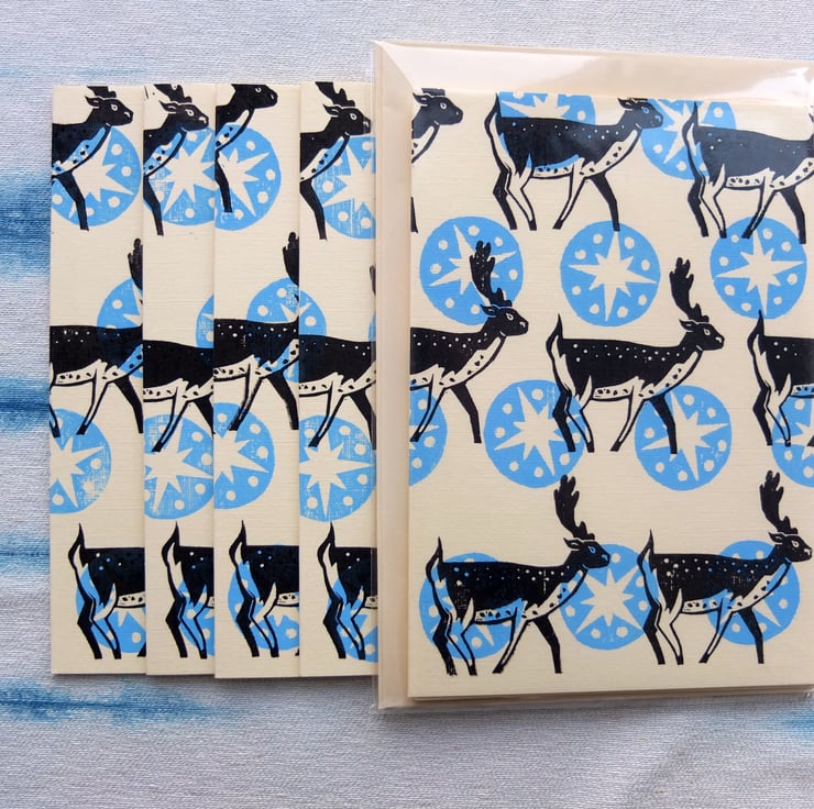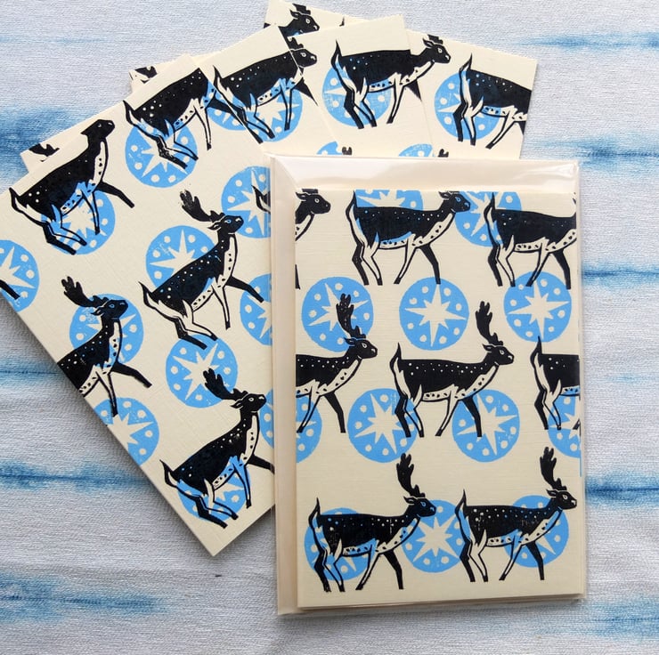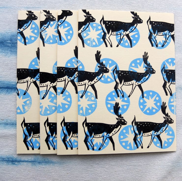 I have a love of pattern and hand printed textiles, this inspired me to make my repeating Christmas cards for a bold, striking effect . Each star and stag are printed individually by hand in two seperate layers using my lino printing blocks.