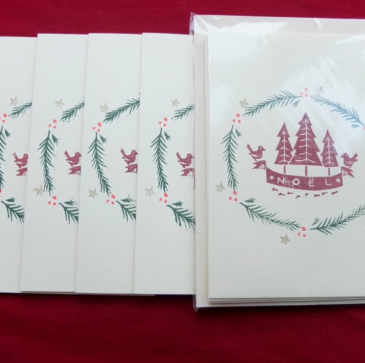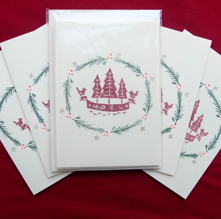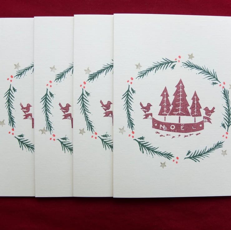 This is a pack of four hand printed Christmas cards with envelopes printed on textured ivory card using water-based inks. The cards measure 14.5cm x 10.5cm